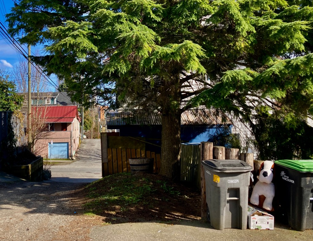 I”m standing at 3rd Avenue & Ontario Street, the intersection at the north-east corner of that L-shaped site, outlined in red. This is the huge redevelopment site purchased by the PCI Group in 2021, whose redevelopment proposal finally received City approval in May of this year. Cheshire Cat Smile is mid-way down lot 5, on the south side of the alley.