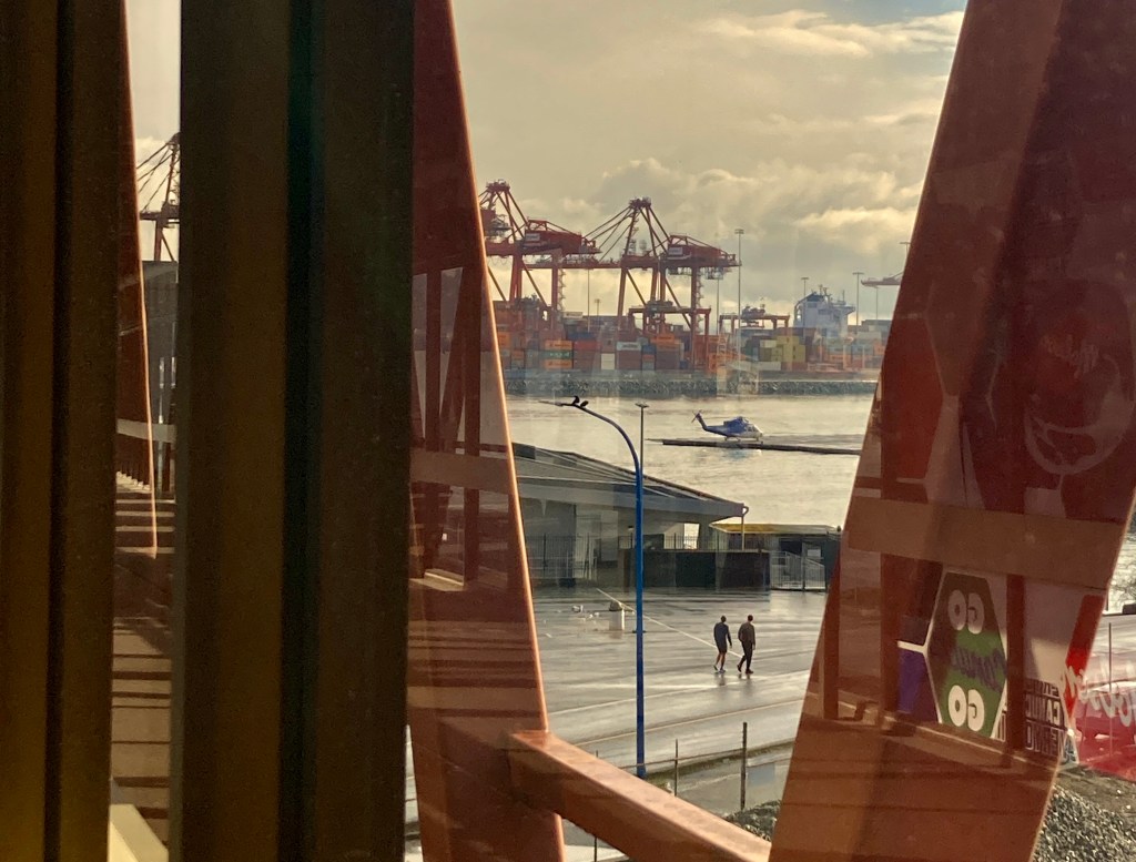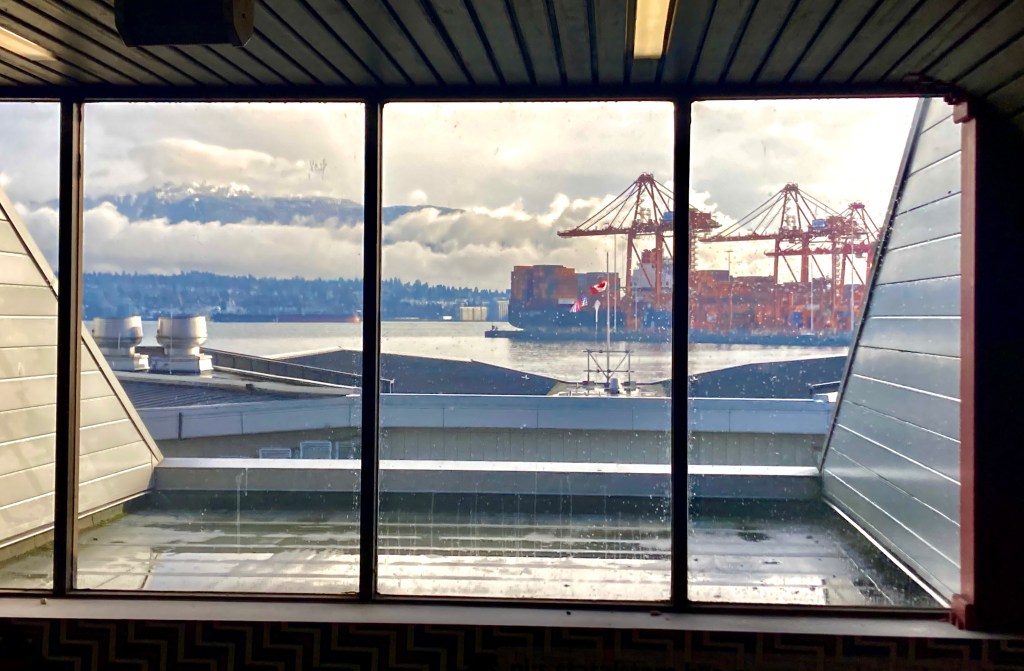 There’s the Vancouver Harbour Heliport, caught in the V-slashes of these window frames, with a helicopter on the pad, and maritime clutter all around — a line-up of harbour cranes, stacks of shipping containers below their voracious grasp, and two crows on the light standard so you know you’re in Vancouver. Plus reflections dancing merrily on the window pane.