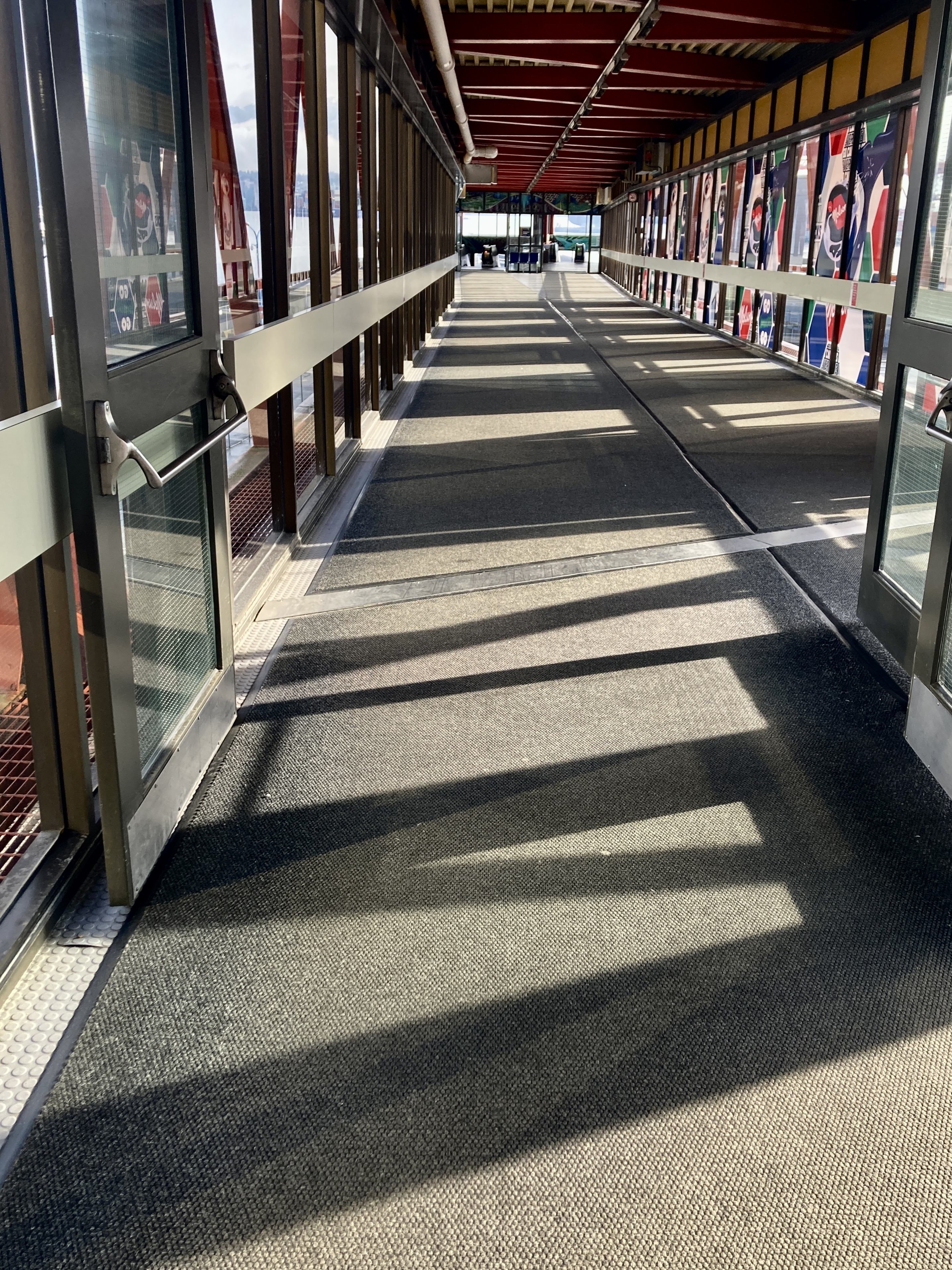 I’m in the long approach to the Waterfront SeaBus Terminal, in the connector between Waterfront Station, with all its urban transit links, and the SeaBus Terminal proper, down at water level. It’s a sunny/cloudy/rain-splattered day, with the intervals of sunshine throwing long shadows across the walkway.