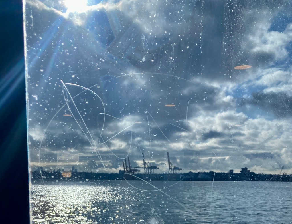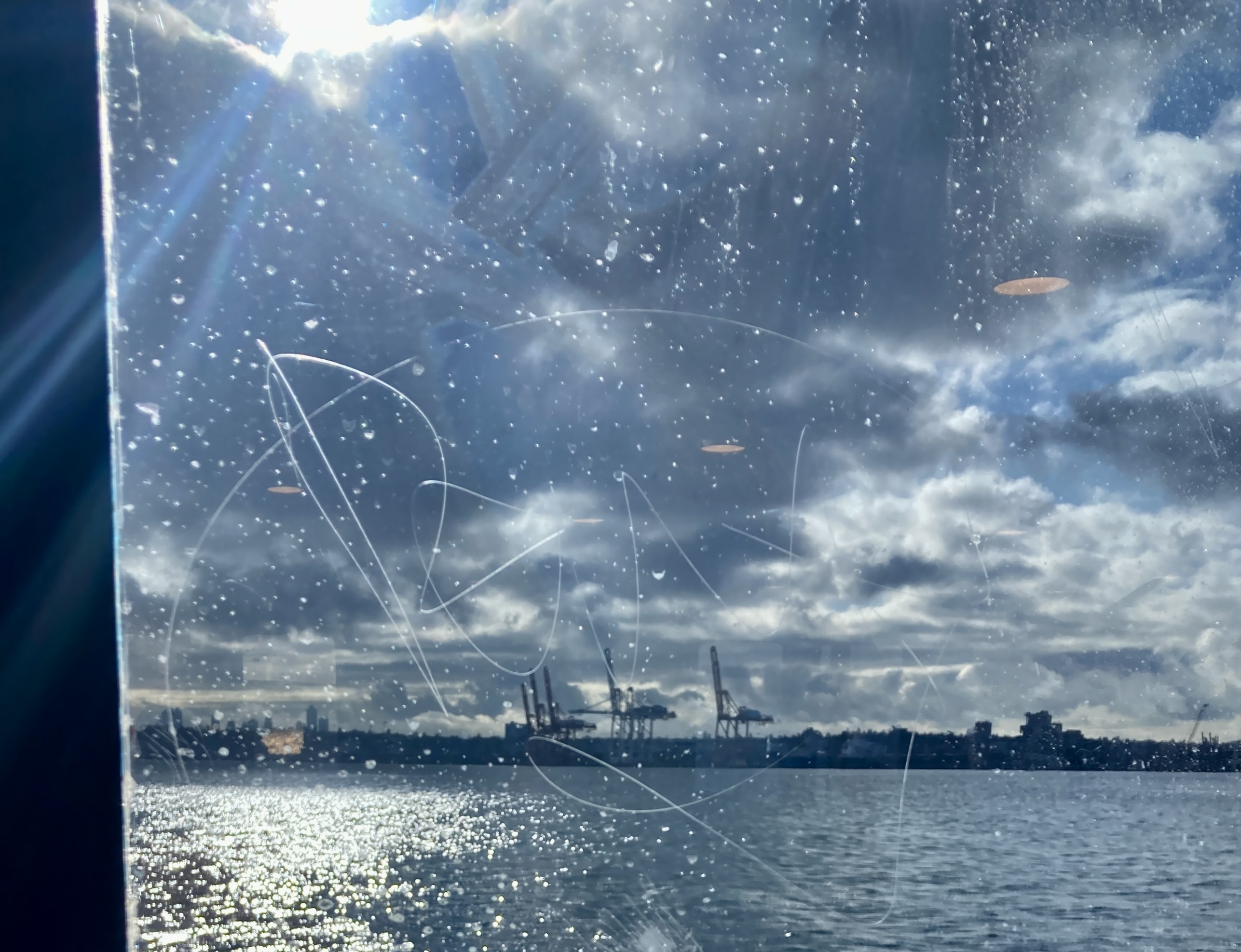 and the scratched & splattered window of the ferry I catch rewards me with sun dogs that bounce silver across the water. (Brooded over by those cranes.) (And by pale reflections of overhead lights, here inside the ferry.)