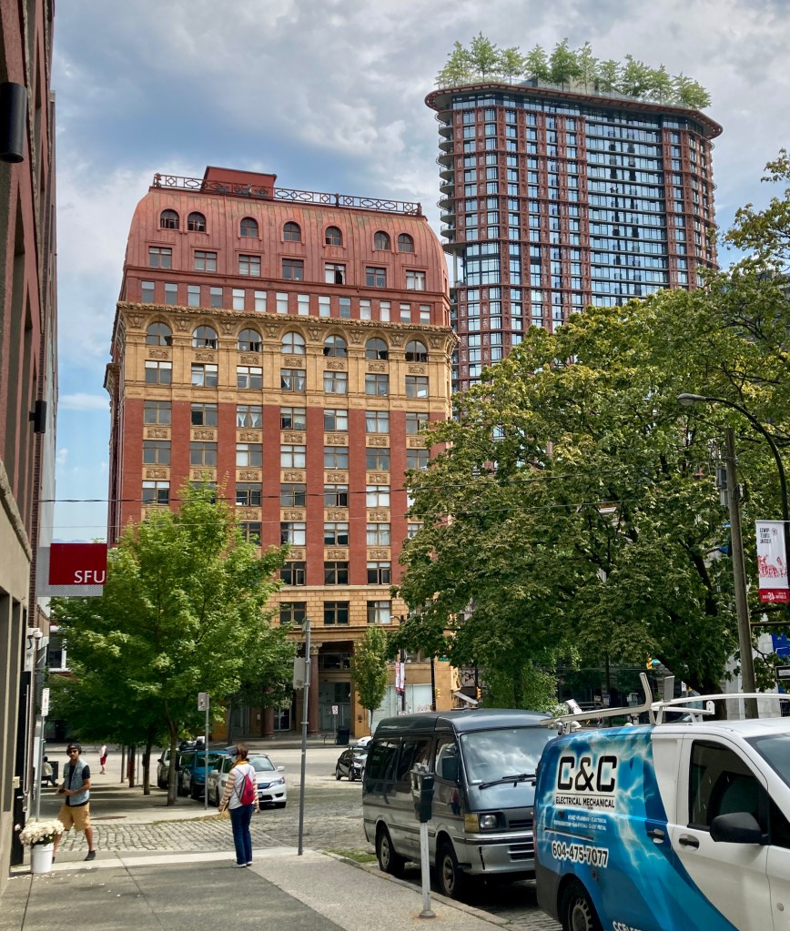Leaning in from the far right, the Edwardian-era Vancouver Club, which opened in 1914. Behind it, a more recent building whose tones (like W-43) are sympathetic to its heritage neighbour.