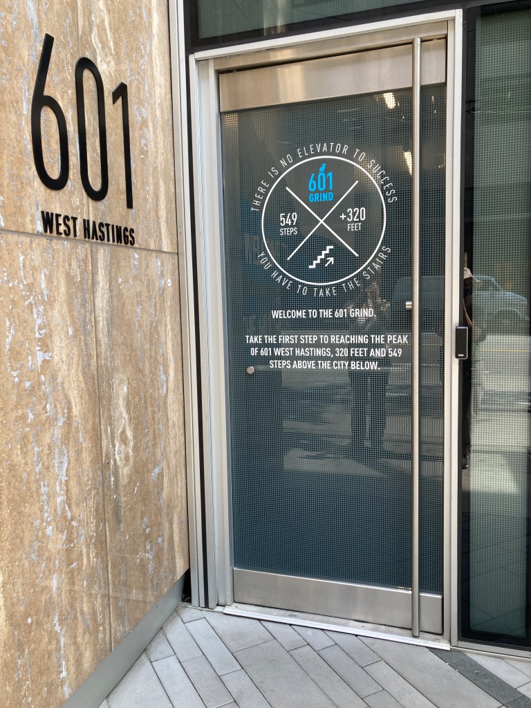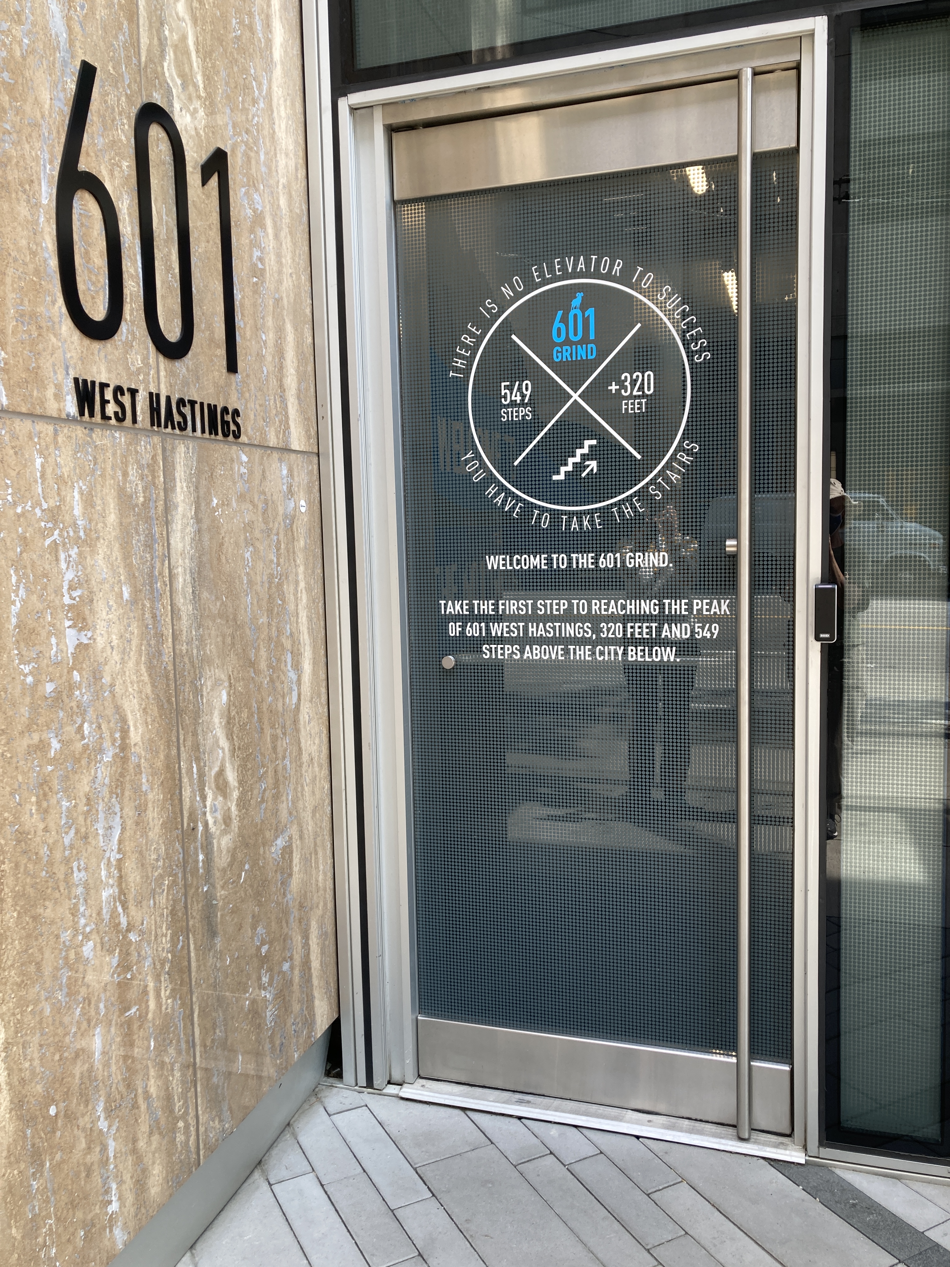 “Grind”? It is a reference every Vancouverite (or visiting hiker) will immediately catch. The Grouse Grind is a 2.9 km trail straight up (very up) the face of Grouse Mountain; the 601 Grind is 549 steps straight up this building.