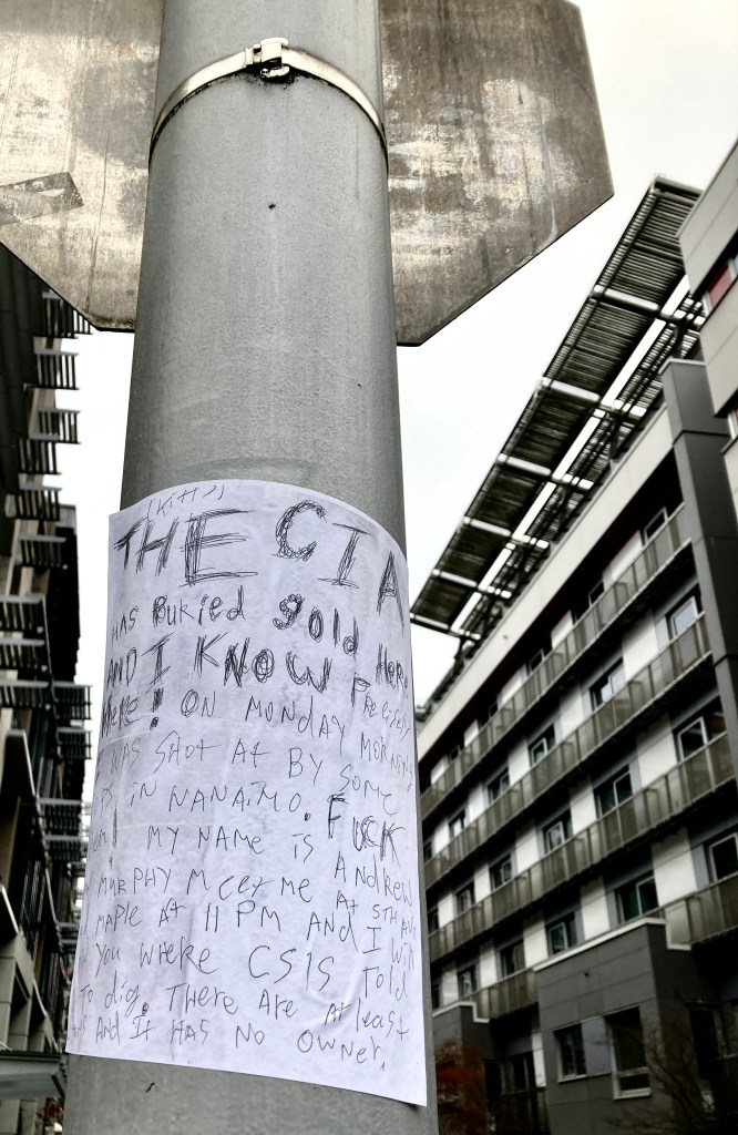 This gentleman, in largely legible and fairly grammatical prose, states that the CIA has buried two tons of gold in a secret location beneath the City of Vancouver — and he knows where it is. (Which, he adds, is why the cops shot at him the other day and CSIS is pursuing him.)