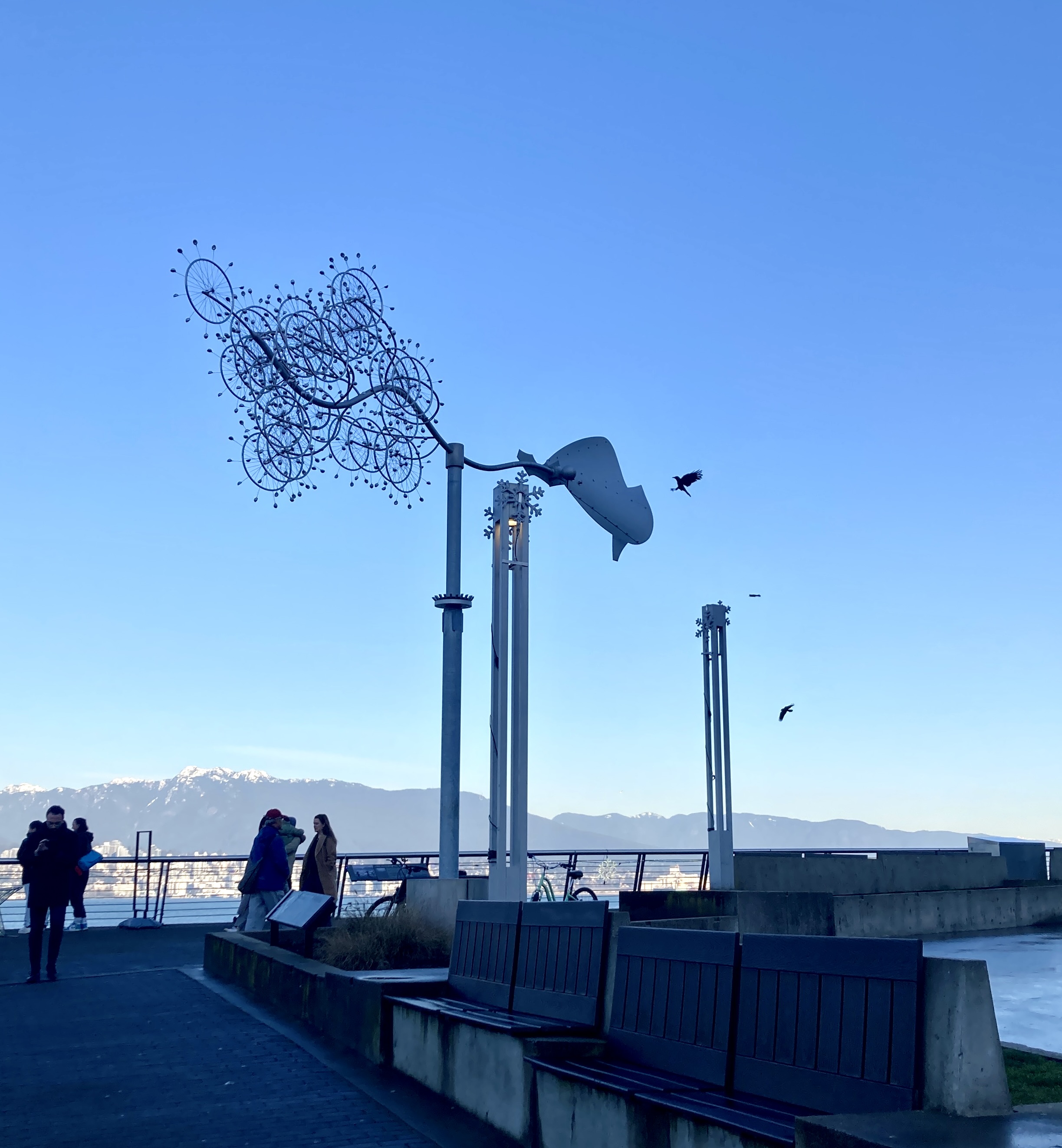 It is a breezy-clear day that rewards a walk along the Coal Harbour stretch of Burrard Inlet — even if afternoon light is already fading by the time I reach this installation, which overlooks the Vancouver Harbour Flight Centre from its spot beside Vancouver Convention Centre West.