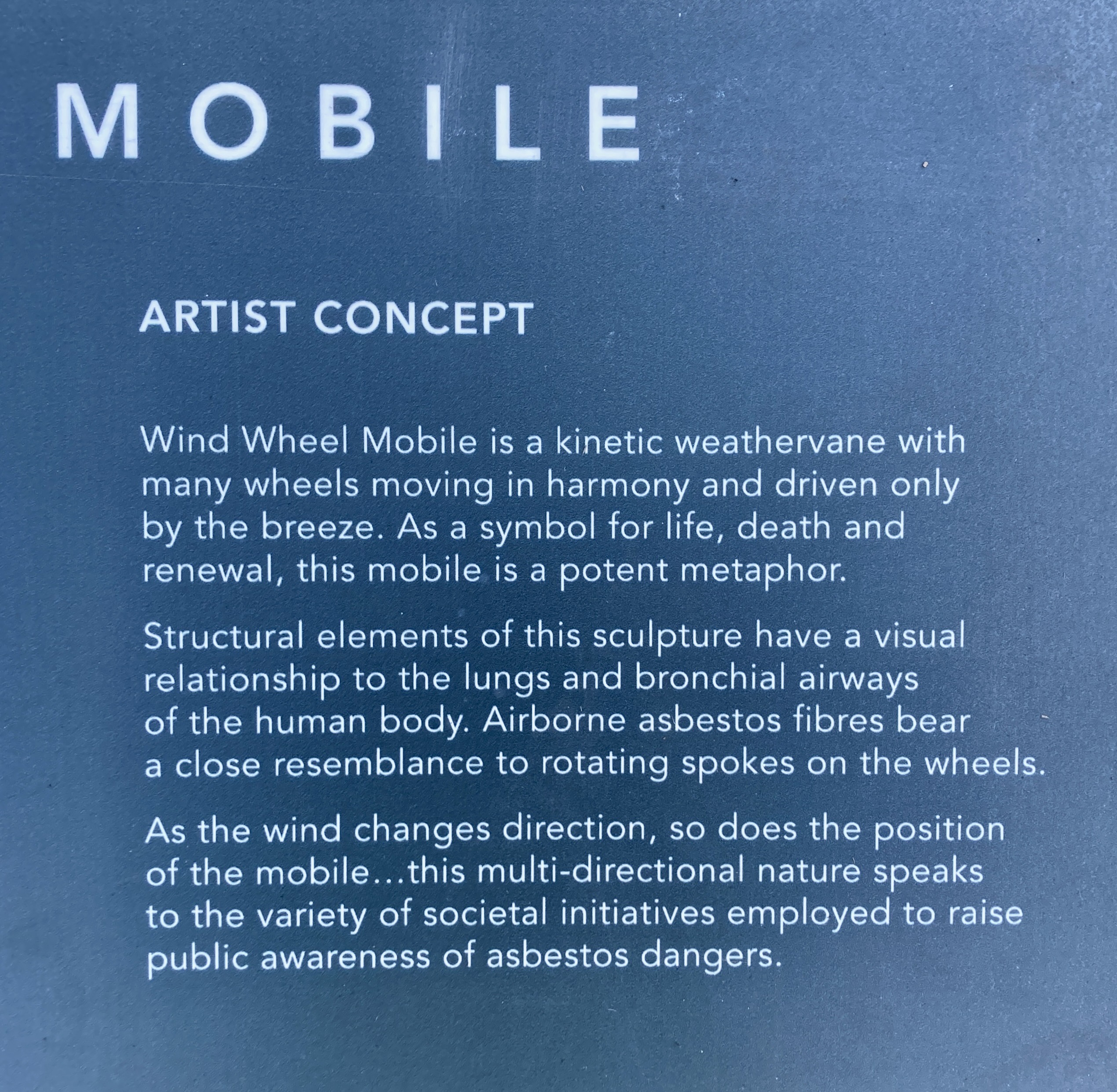What we have on this side, in this Wind Wheel Mobile, is a memorial to the workers who loaded asbestos over there for so many years.
