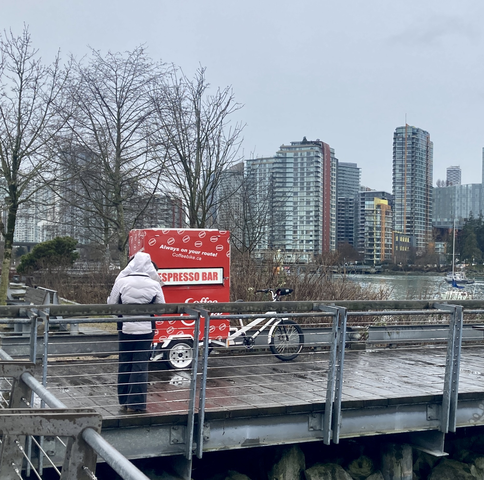 and let’s ignore yesterday’s sullen drizzle that had this would-be patron waiting in vain for someone to open up the Espresso Bar at False Creek and start serving coffee.