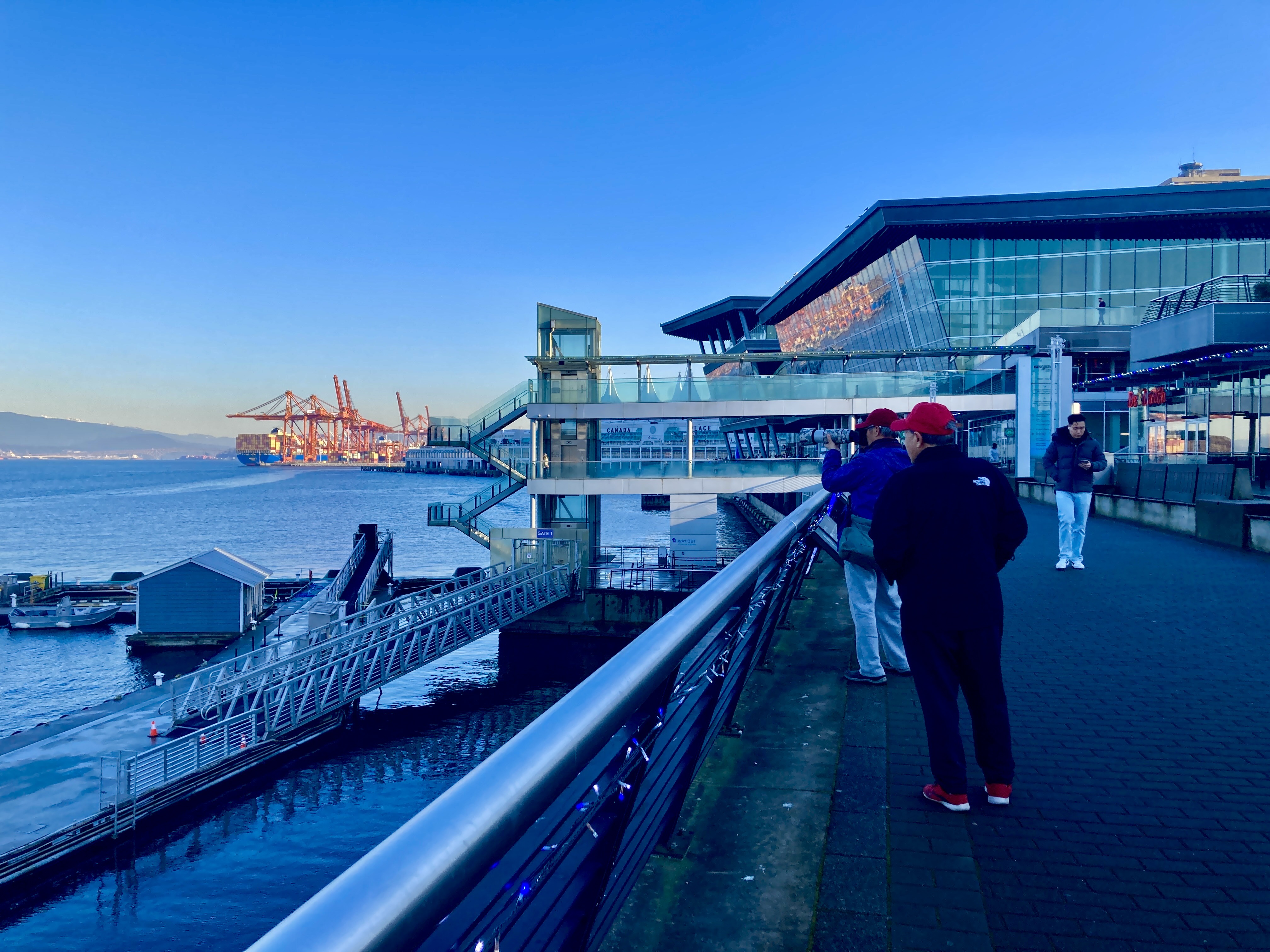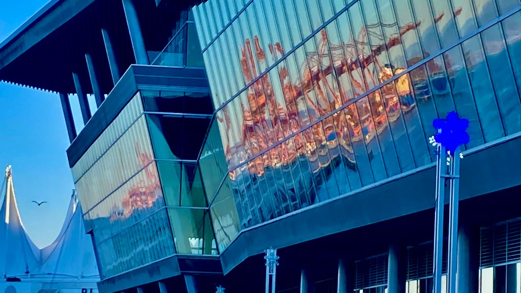 I am almost immediately captivated by another storyline — this one created by the dance between the two sites now in front of me. Orange harbour cranes, down there on the left, bounce a fiery explosion across Convention Centre windows, here on the right.