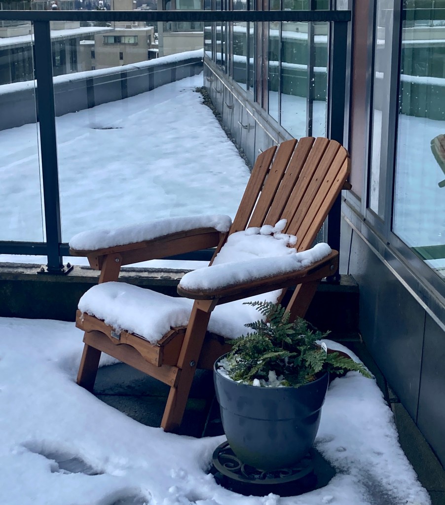 Let’s ignore this morning’s sloppy snow (cleared from the fern by my loving fingers but slumping off the chair all by itself)…