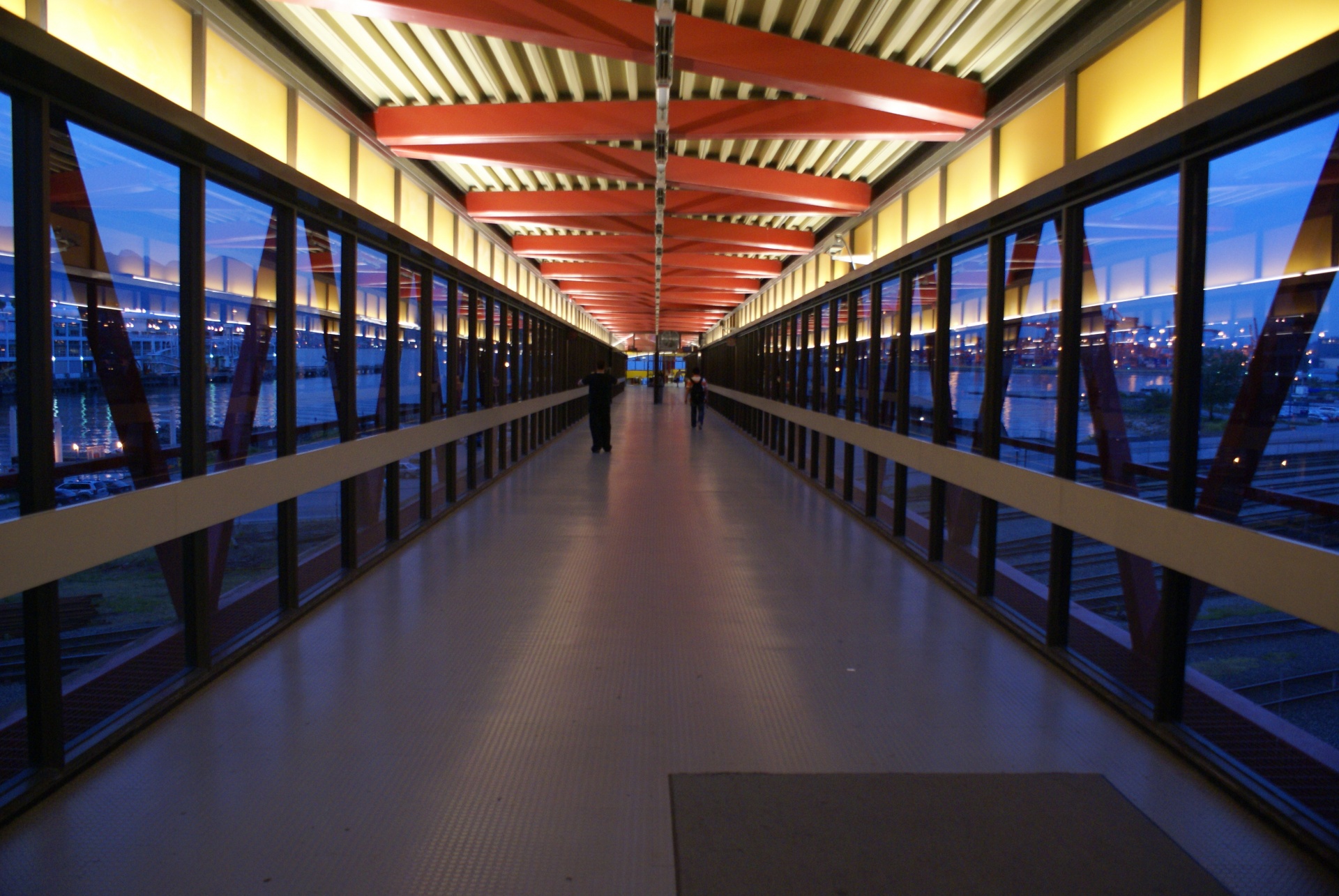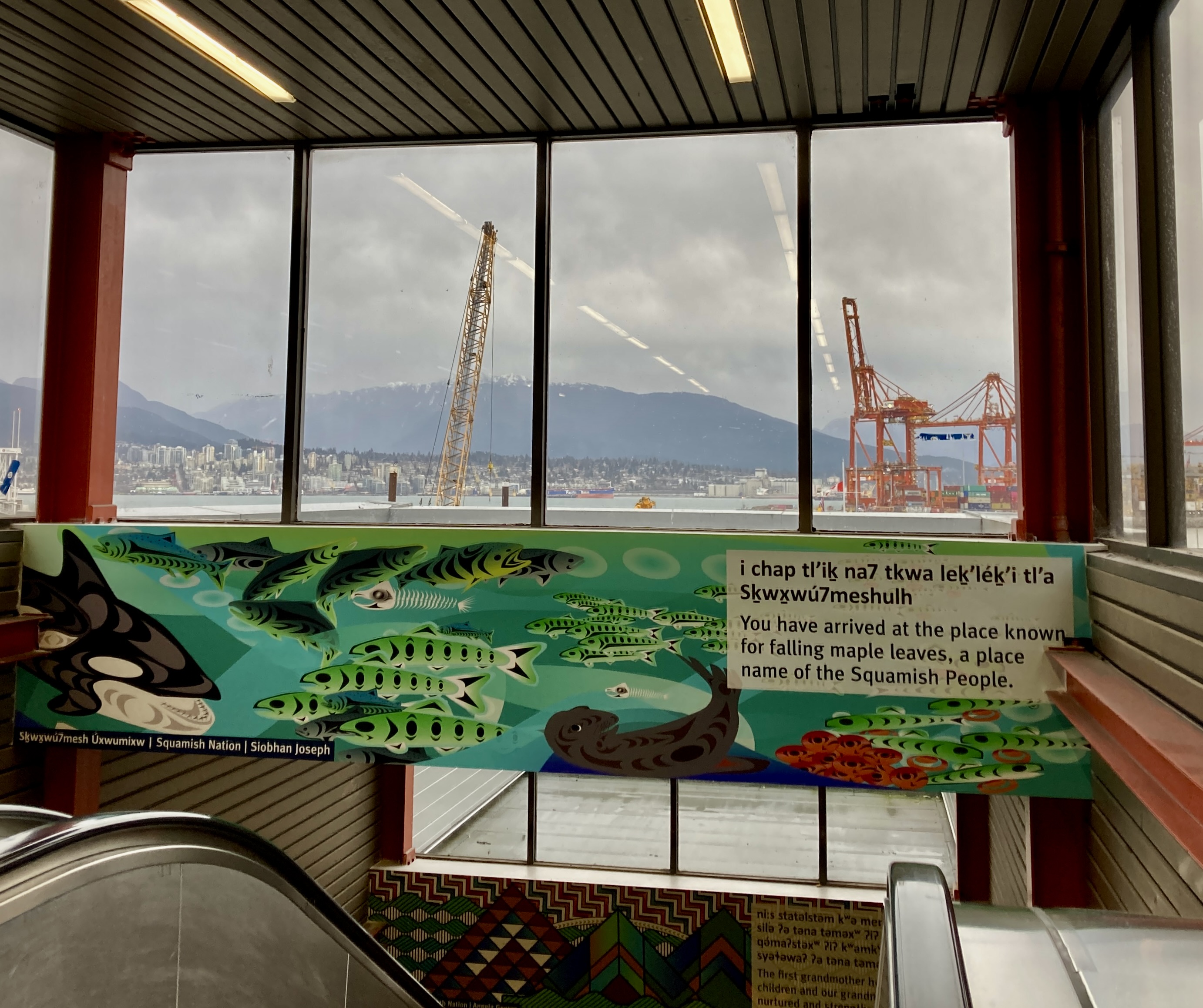 6 January 2023 – I’m on the walkway linking Waterfront Station with the SeaBus terminal on Burrard Inlet — essentially a metal grid with glass side panels that offer long views of the train tracks, Port of Vancouver activity and waterfront facilities.