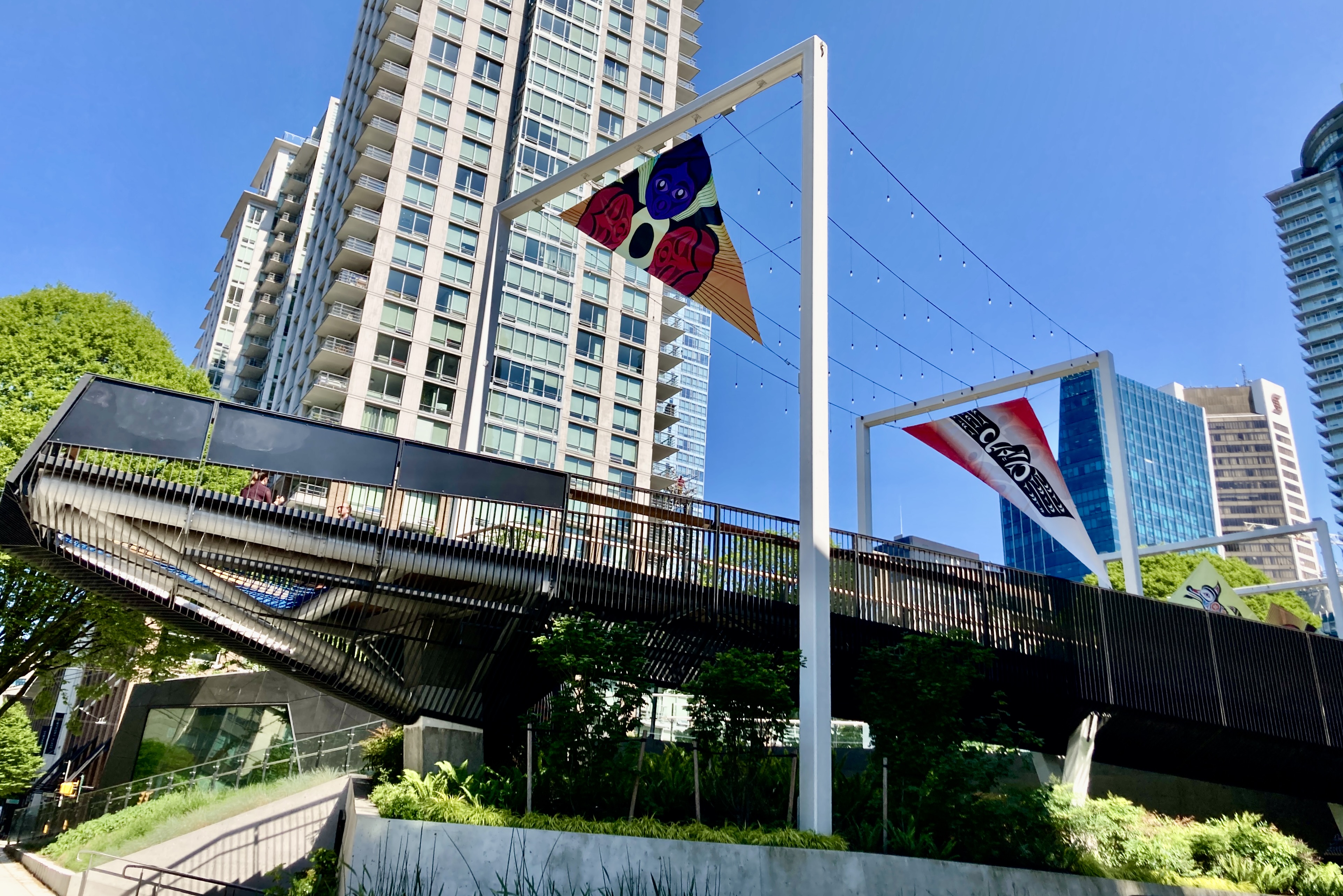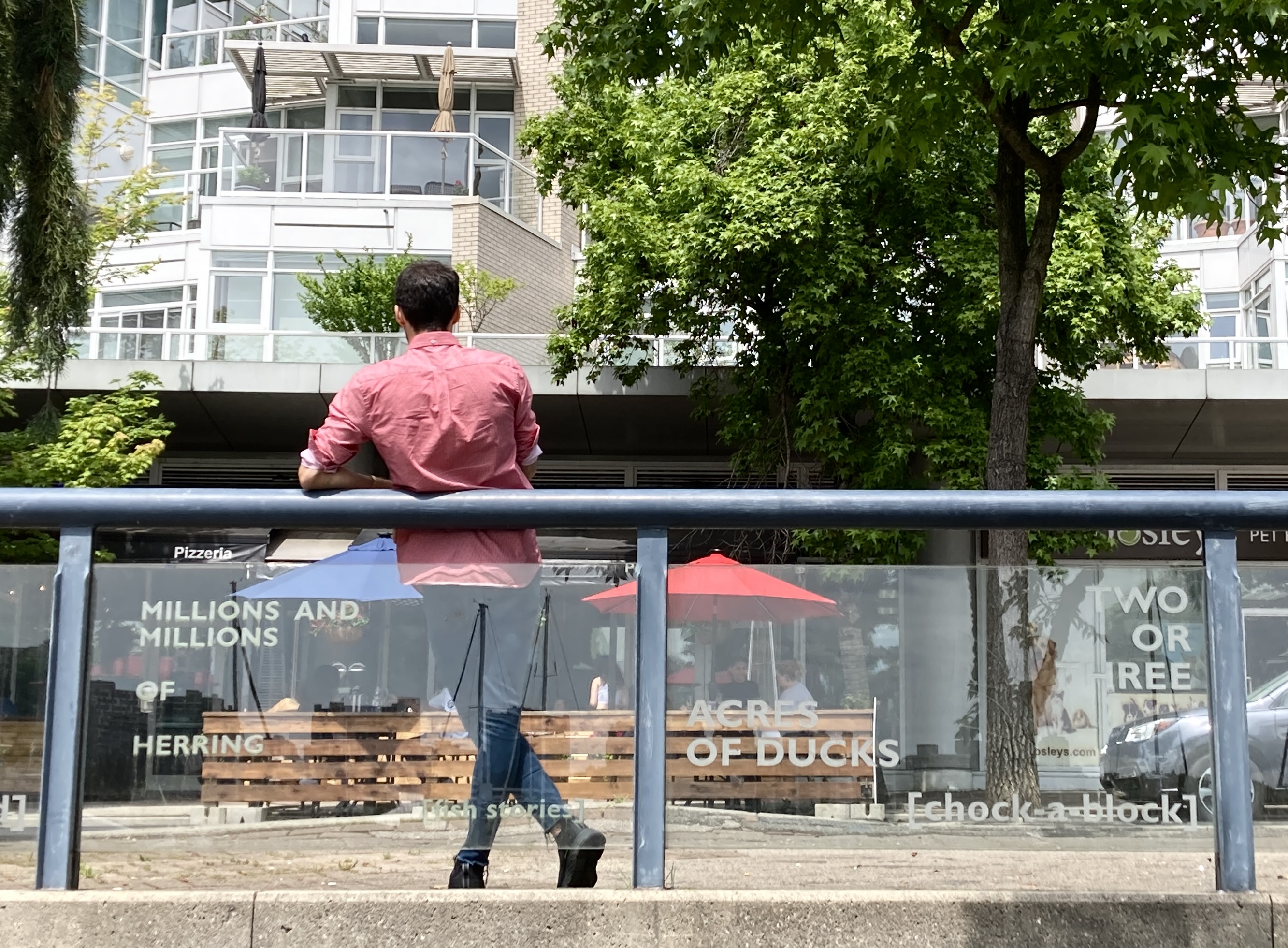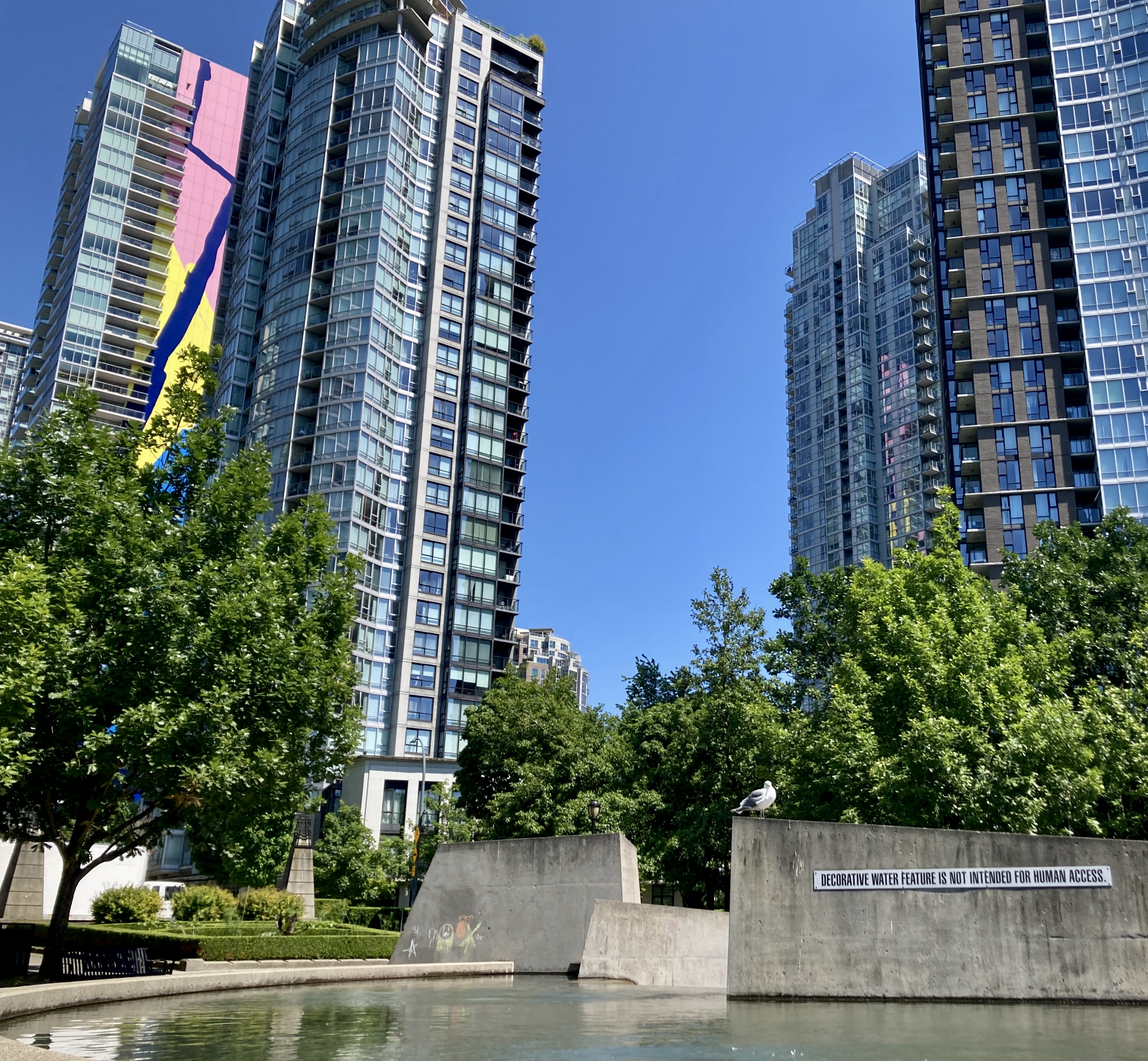 Music festival in the City Centre Artist Lodge forecourt as I walk past; patio umbrellas shading crowds on down Quebec & Ontario streets; and here in Olympic Village Square as well…