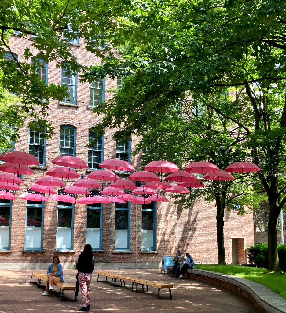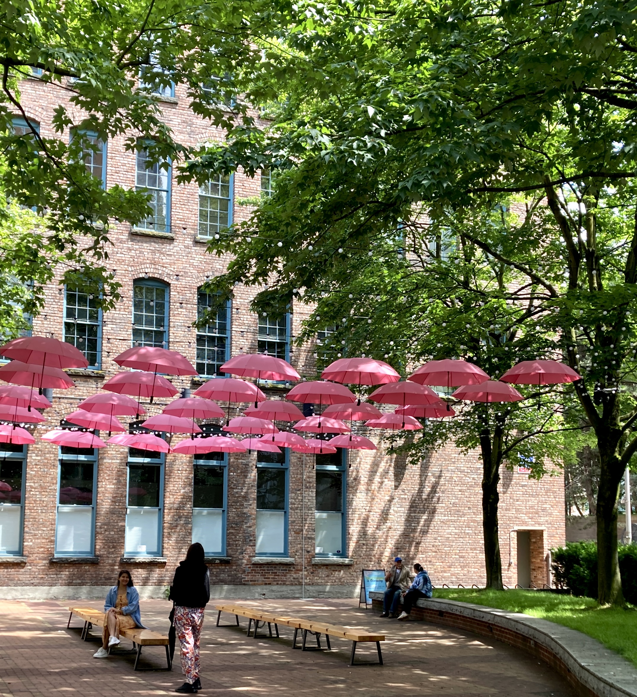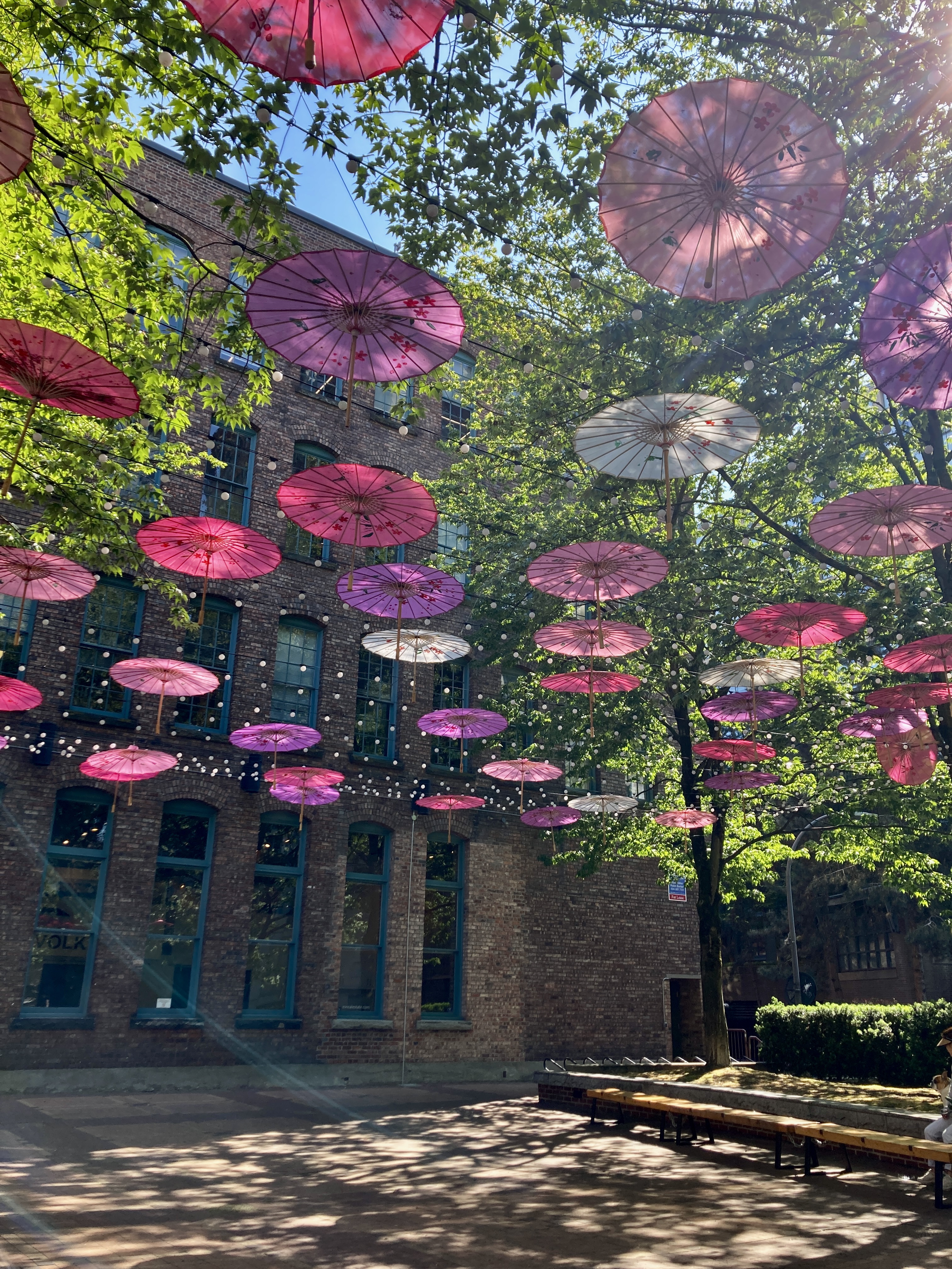 Music festival in the City Centre Artist Lodge forecourt as I walk past; patio umbrellas shading crowds on down Quebec & Ontario streets; and here in Olympic Village Square as well…