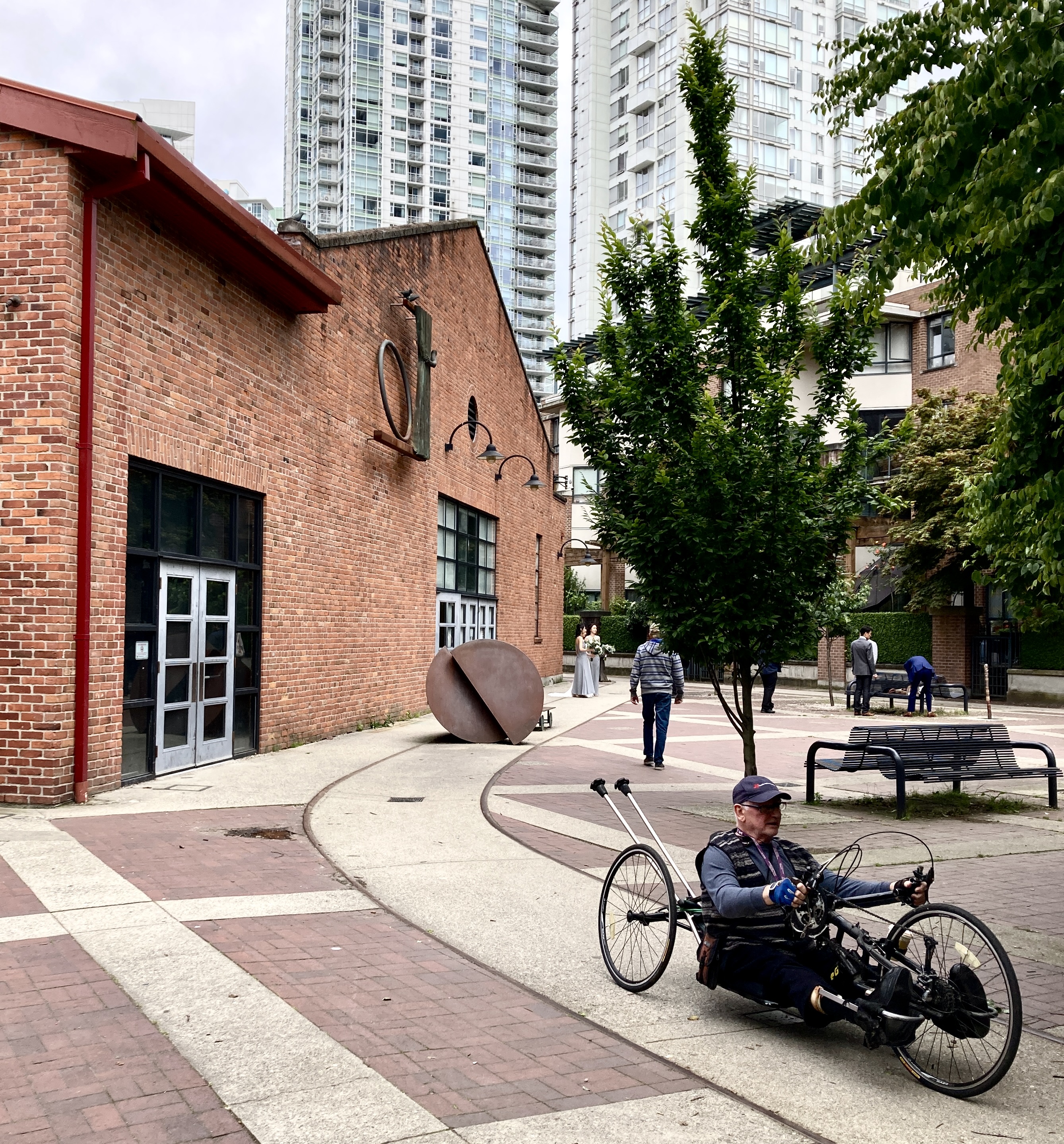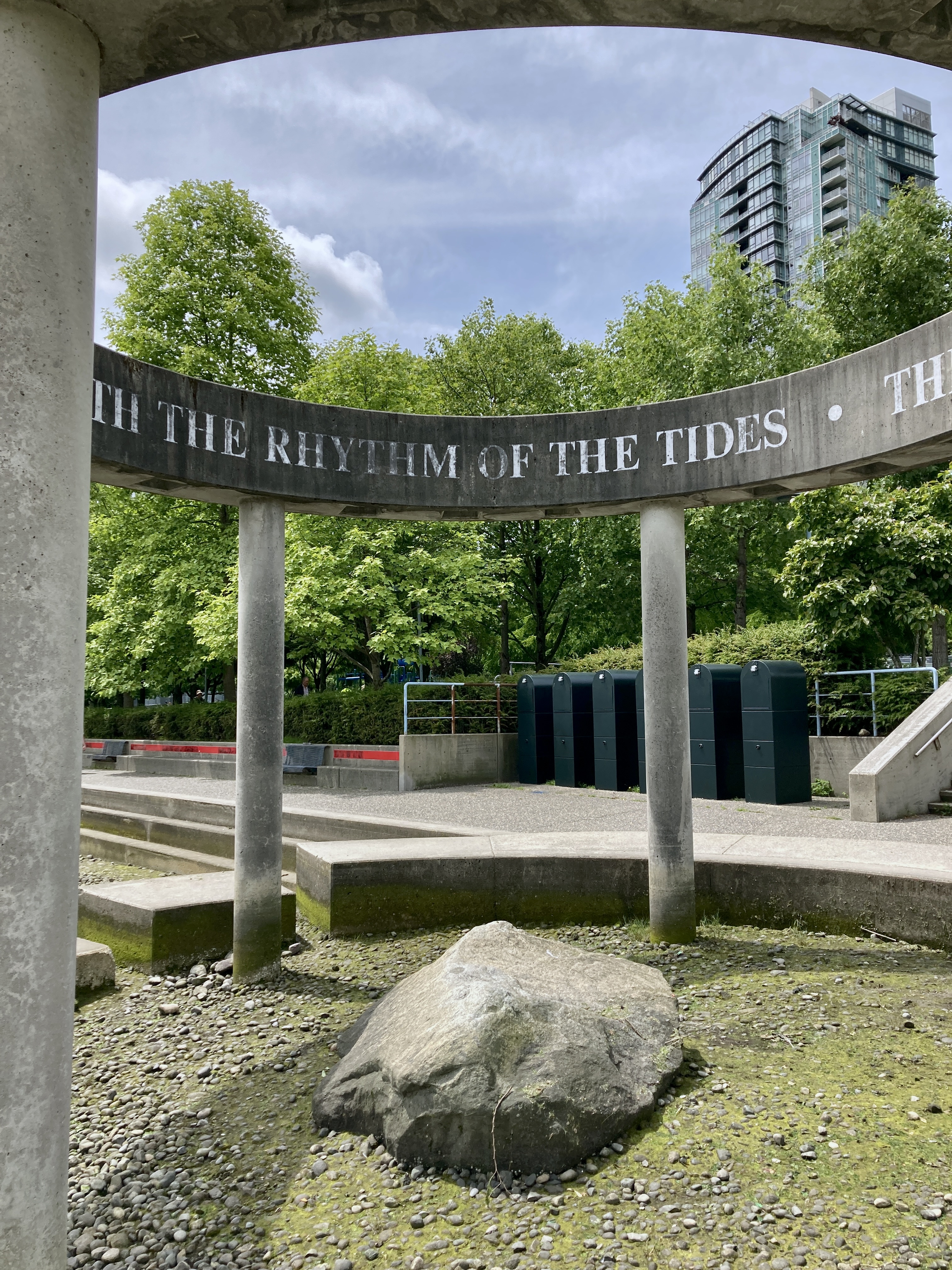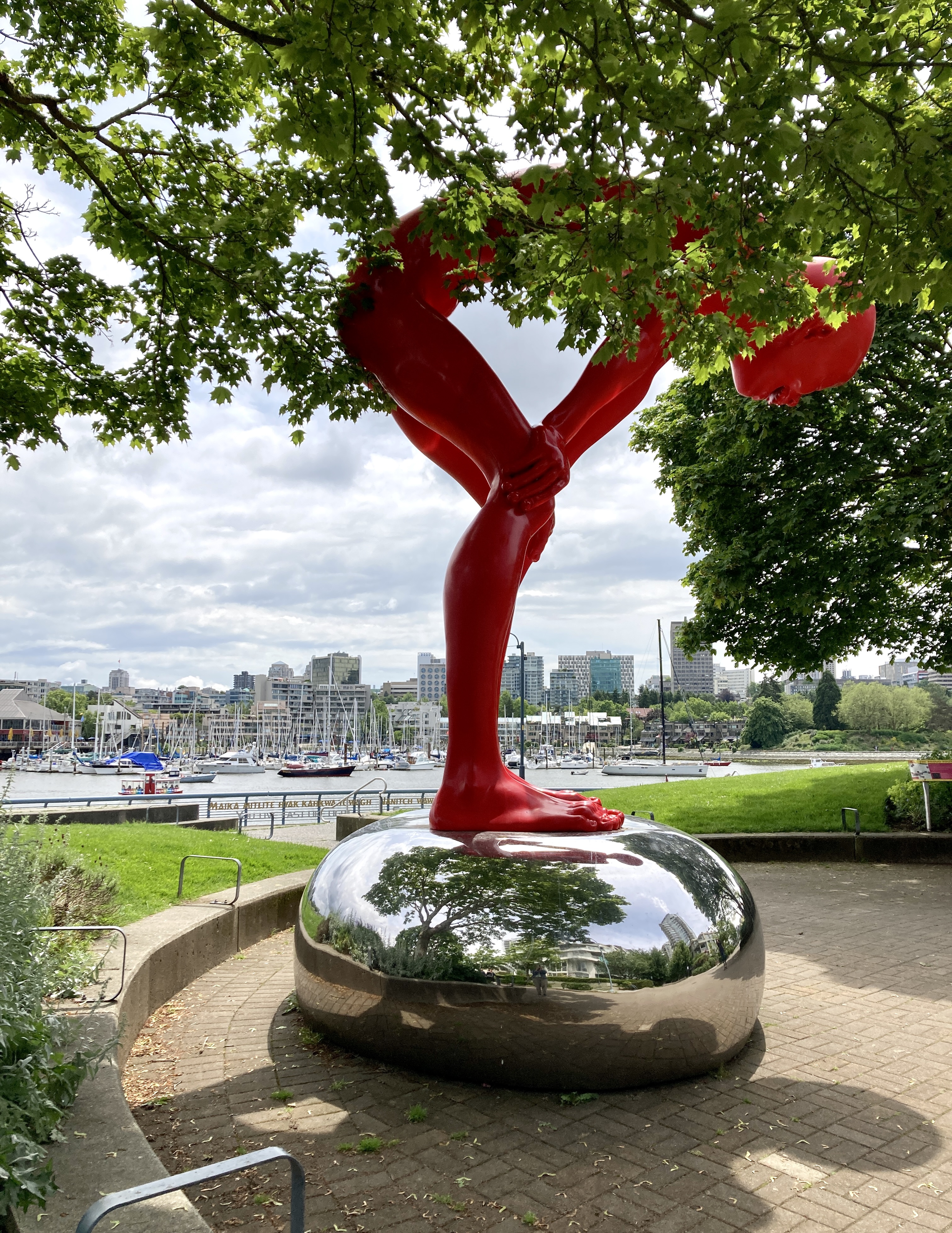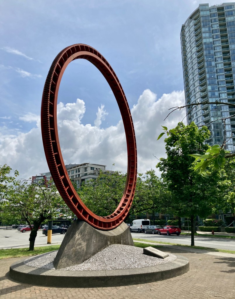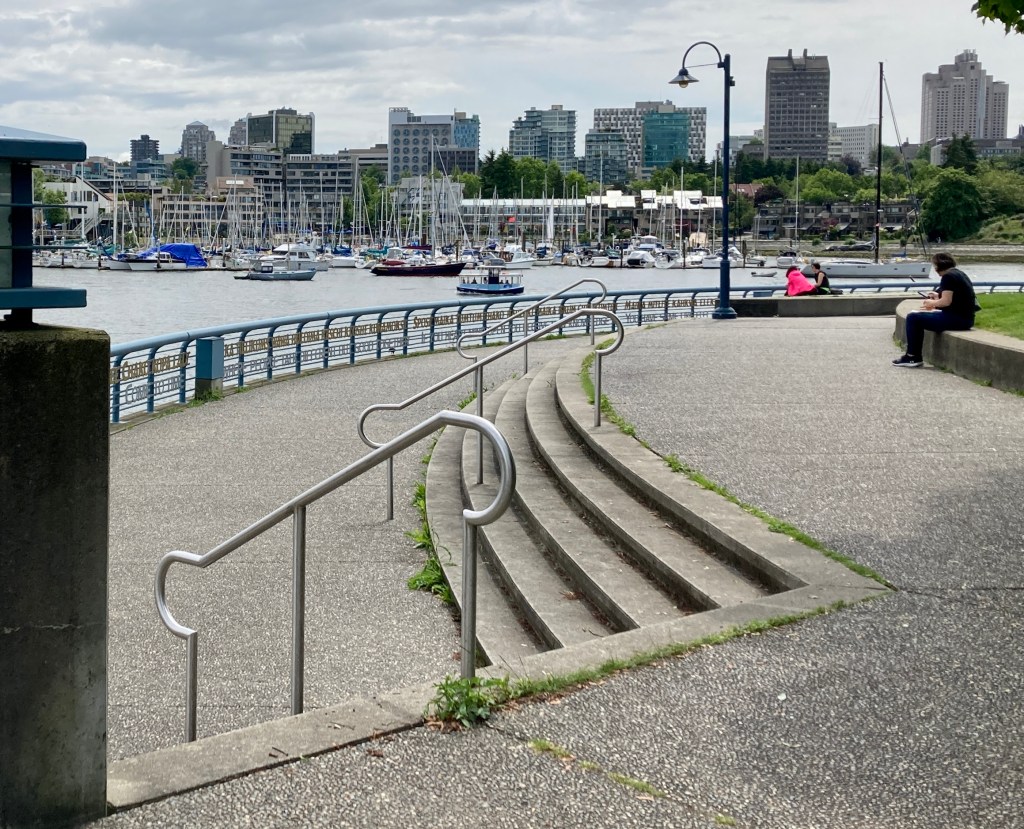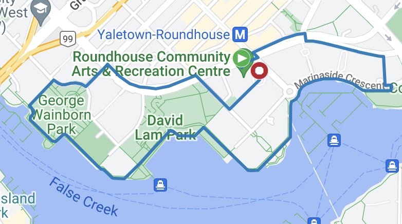 Walk down to The Village ferry dock (south-east end of False Creek, by Olympic Village Square); ferry to David Lam Park dock; walk on west along this portion of Vancouver’s Seawall, on past George Wainborn Park; then up-over the Granville Street bridge; down-around Granville Loop Park… and whatever.