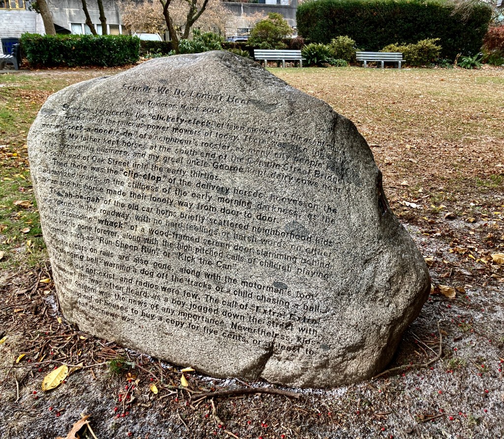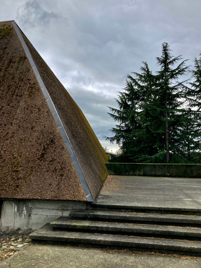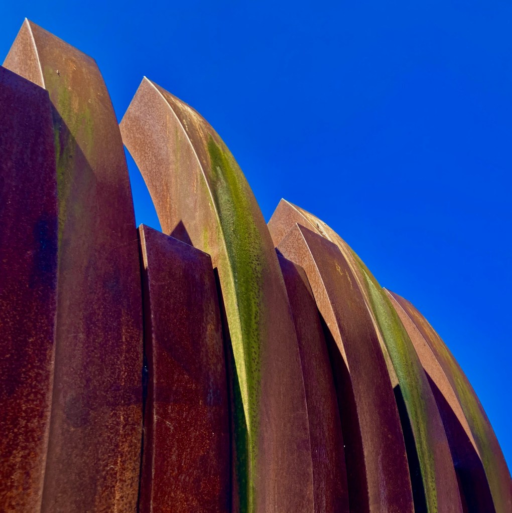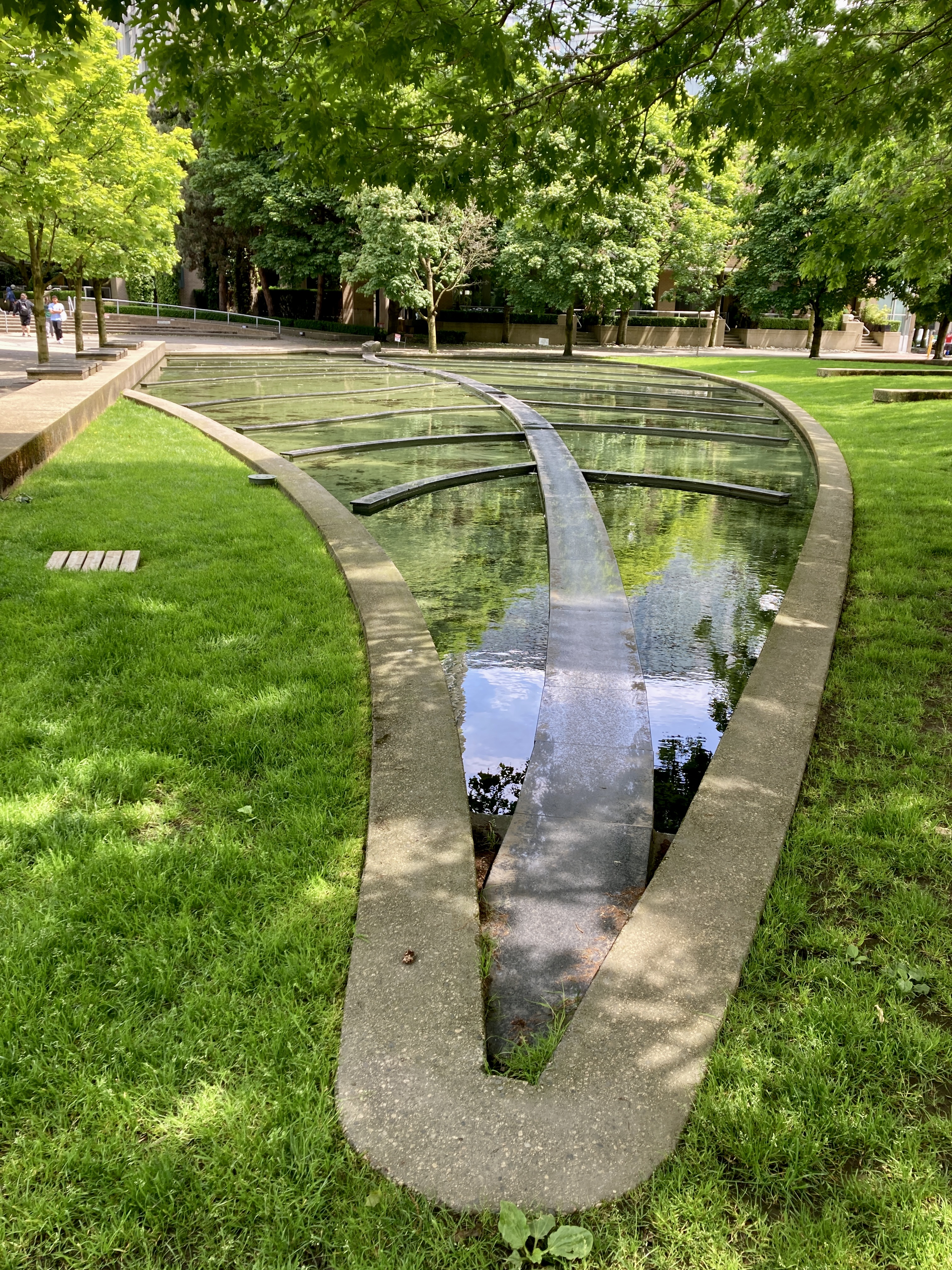 I’m in Granville Loop Park, with a waterfall sculpture that reminds us yet again that, all those centuries ago, Heraclitus got it right. An ever-constant “V” of water, created by ever-changing water molecules, in ever-flowing cascades from the two upper corners.