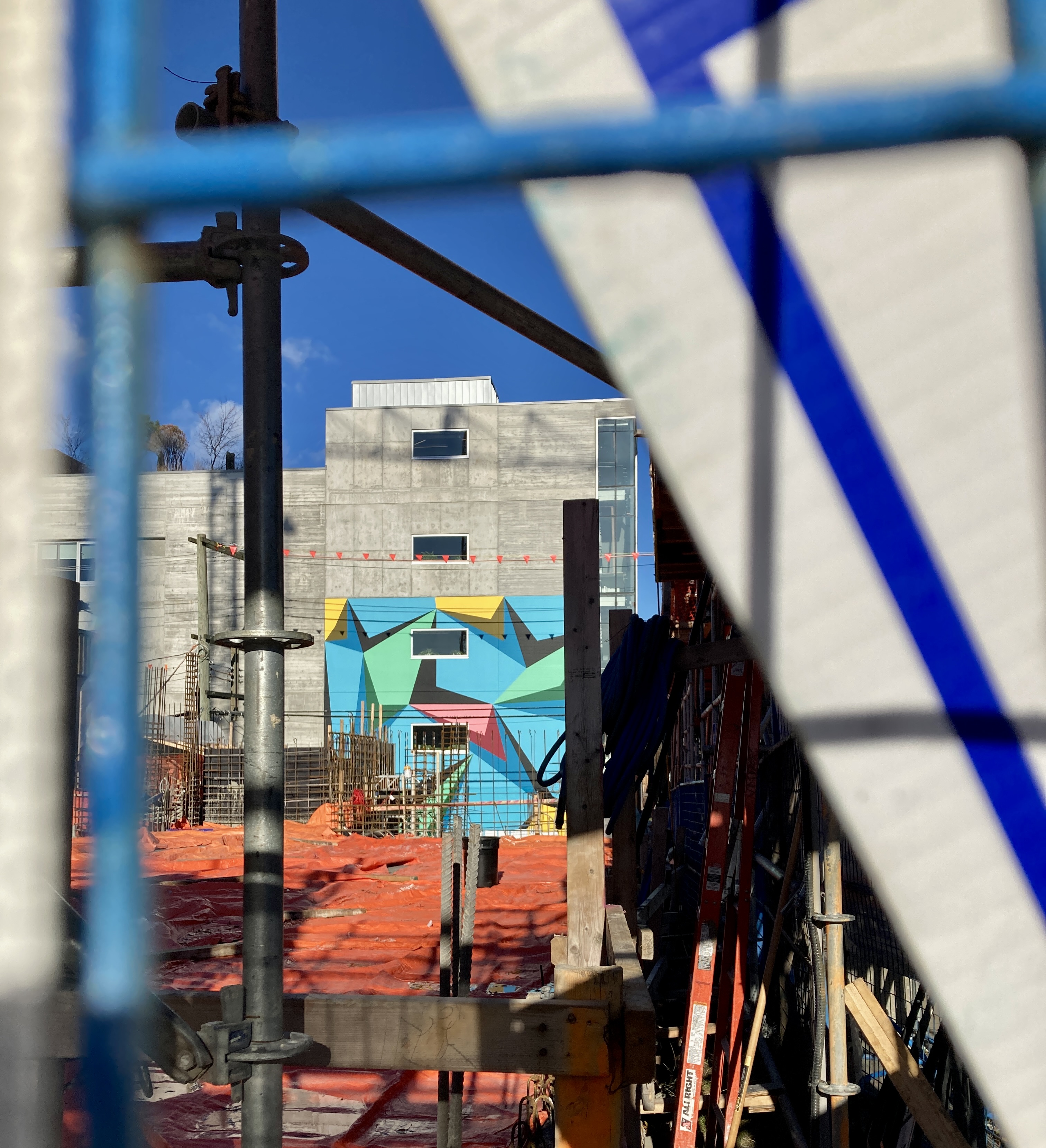 Almost directly overhead, a reminder that this is a working concrete facility, not just a mural backdrop.