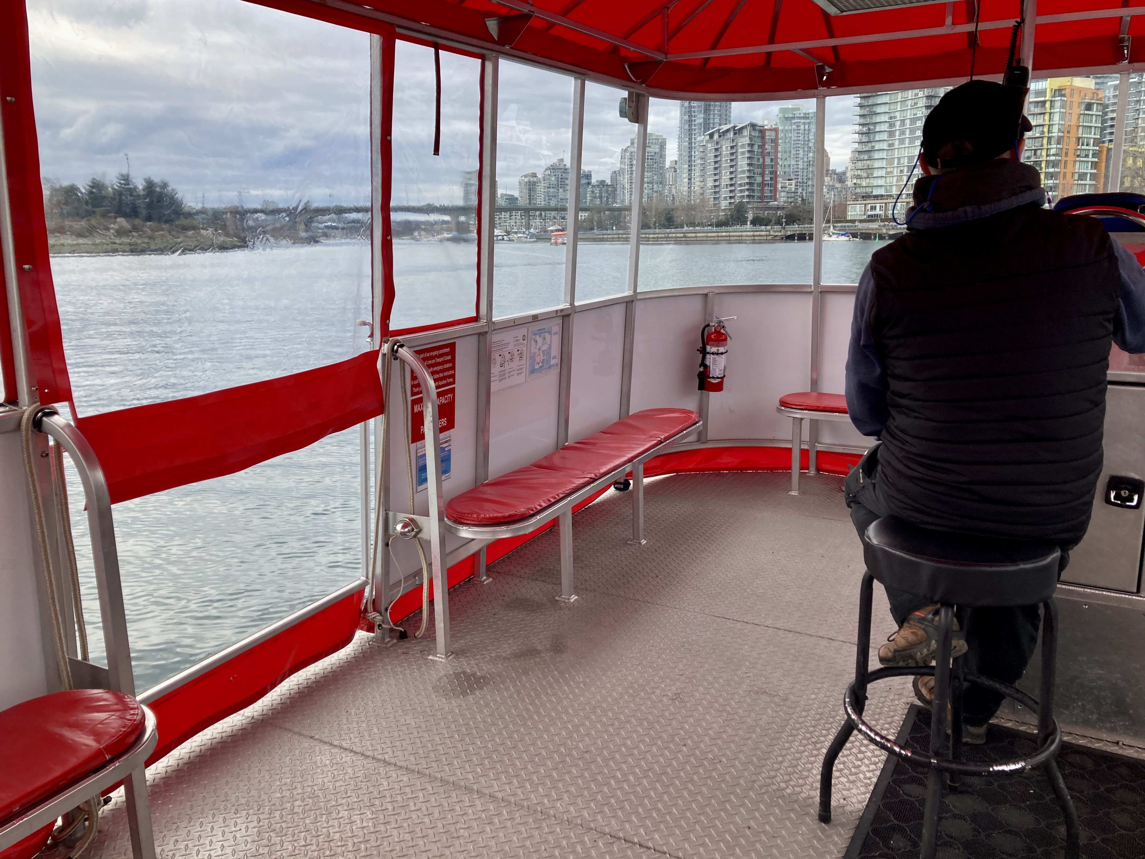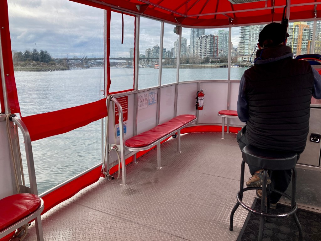 Onto an Aquabus, which is surprisingly empty until we stop at Yaletown Dock and pick up an extended family of Brazilian tourists. As we pull away, the driver, for fee-setting purposes, turns his head to quiz them on destination and demographics.