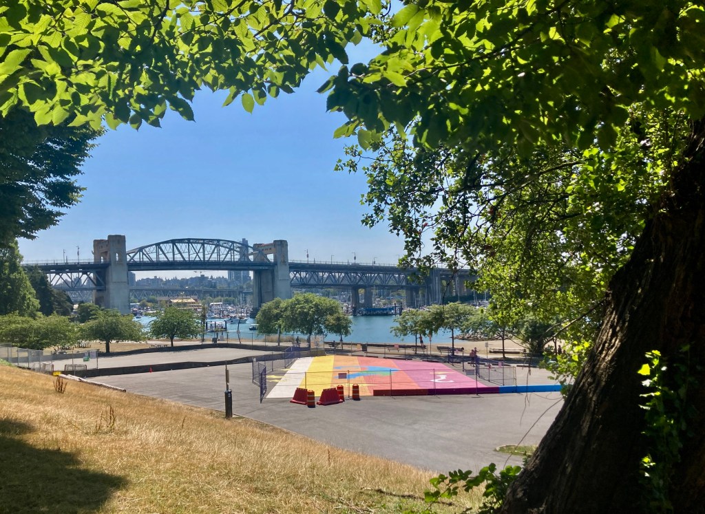 Over land now, over the Granville Island Kids Market and playground, backing onto Alder Bay.