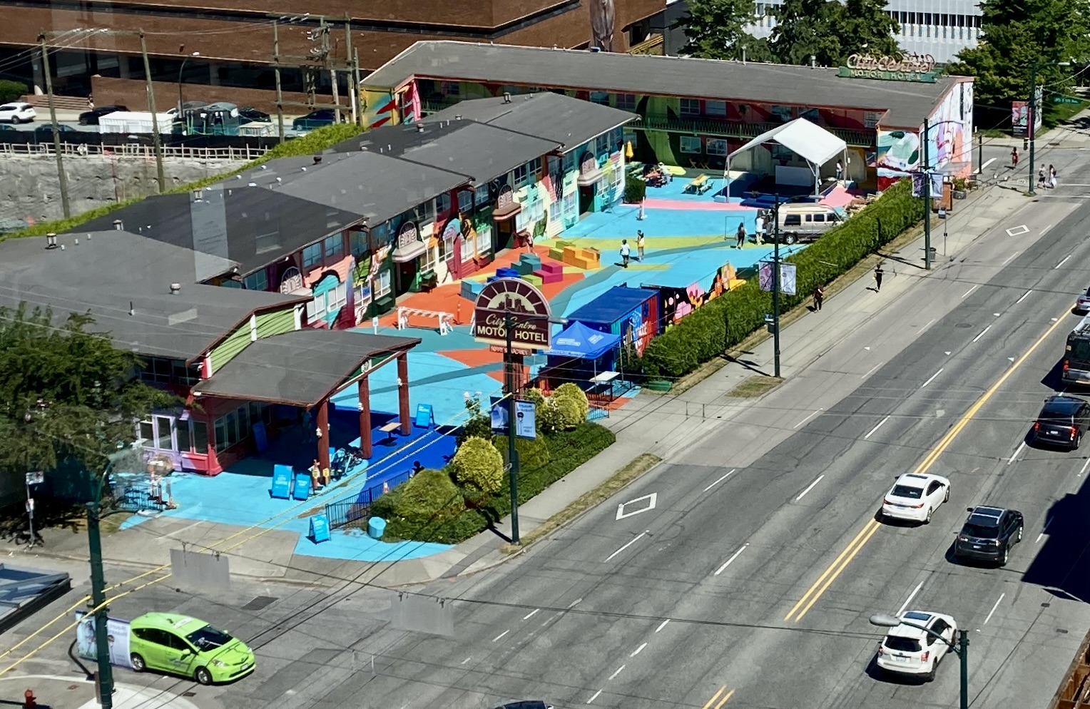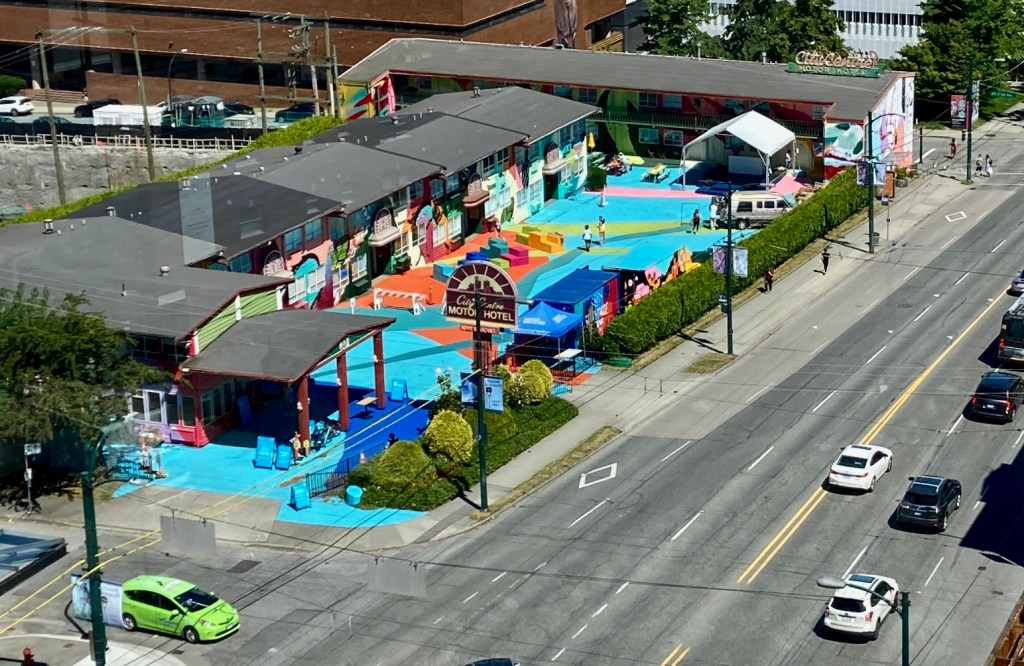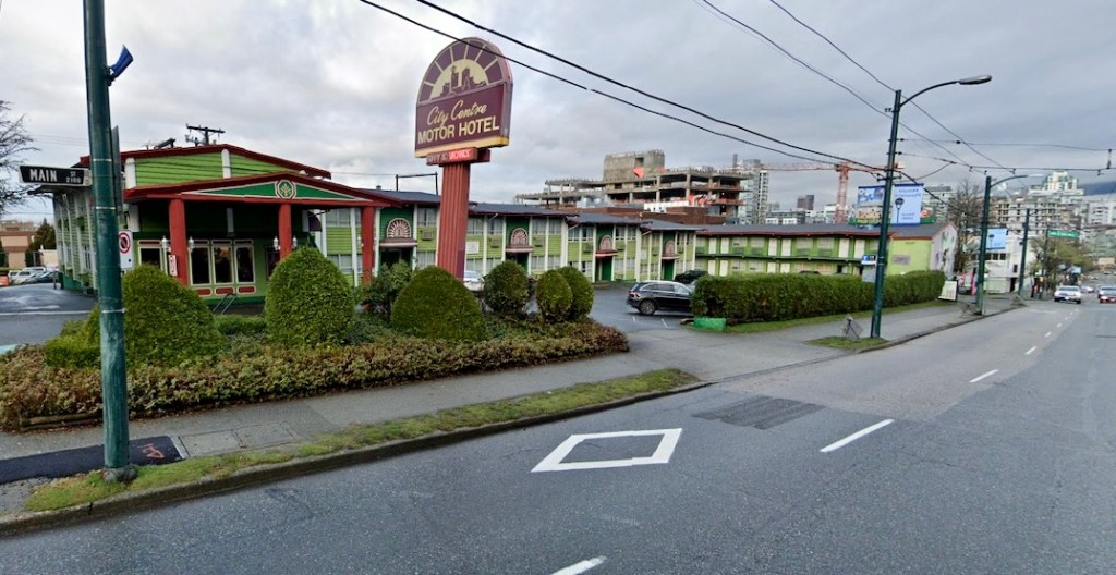 I”m standing at 3rd Avenue & Ontario Street, the intersection at the north-east corner of that L-shaped site, outlined in red. This is the huge redevelopment site purchased by the PCI Group in 2021, whose redevelopment proposal finally received City approval in May of this year. Cheshire Cat Smile is mid-way down lot 5, on the south side of the alley.