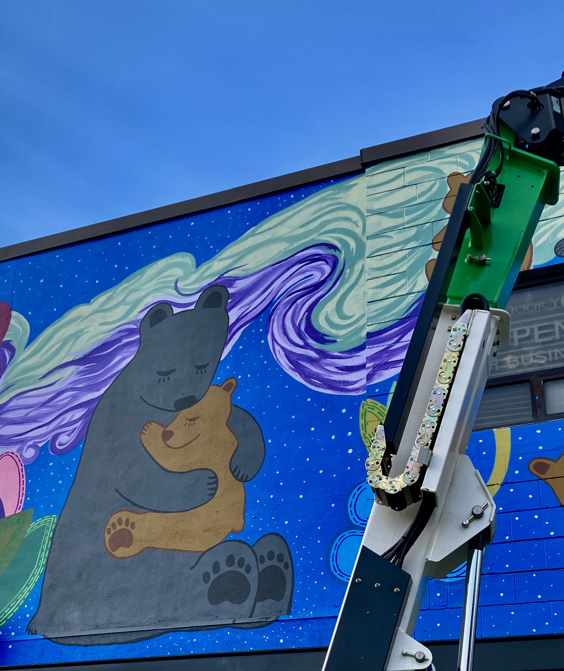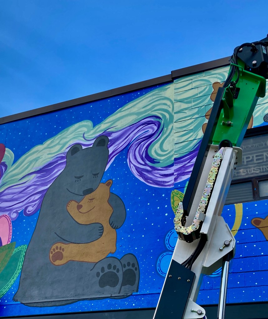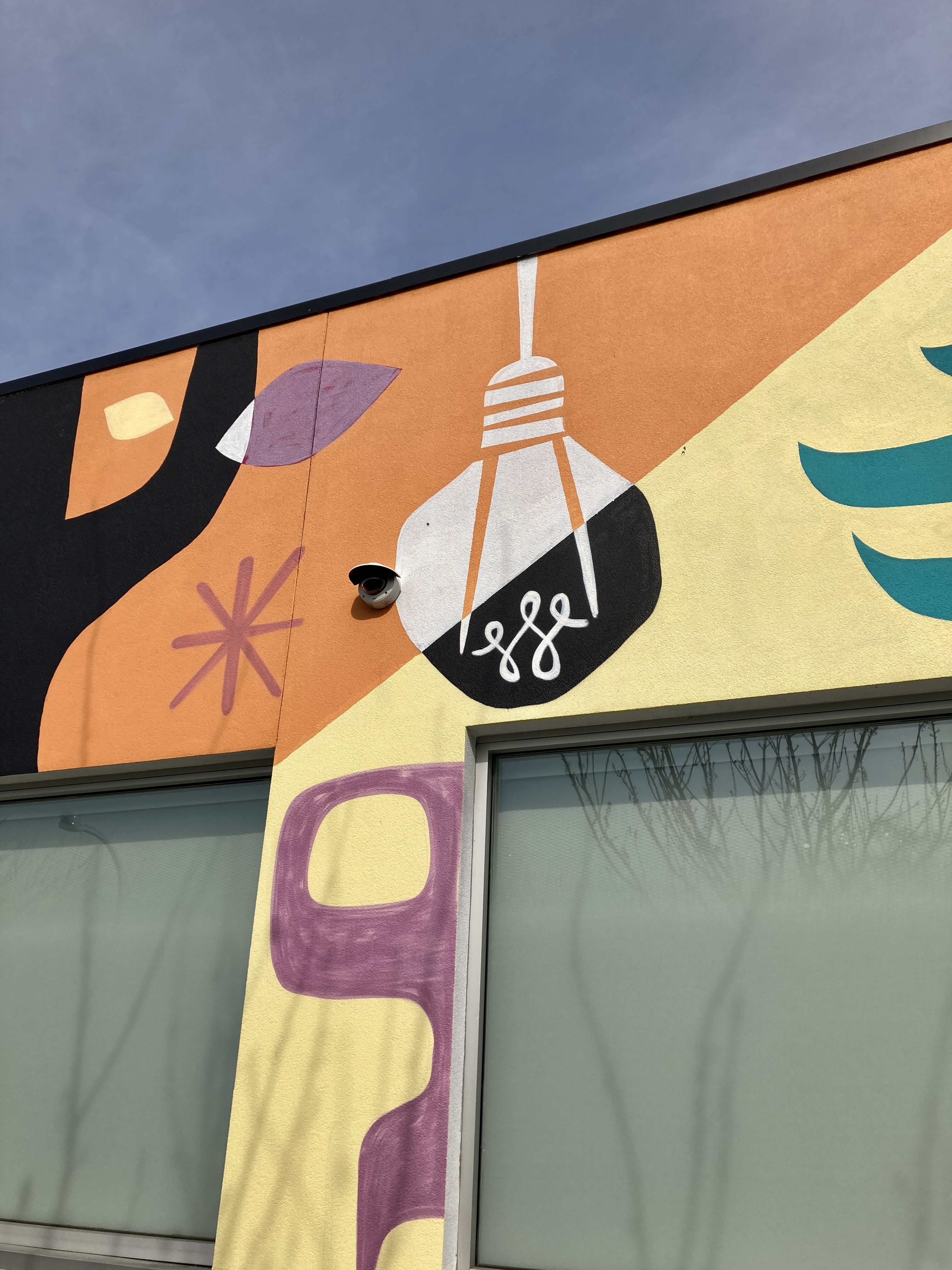 which causes me, for the first time, to pay attention to the mural as a whole — signed R. Tetrault and, as I later learn, called Flight Path.