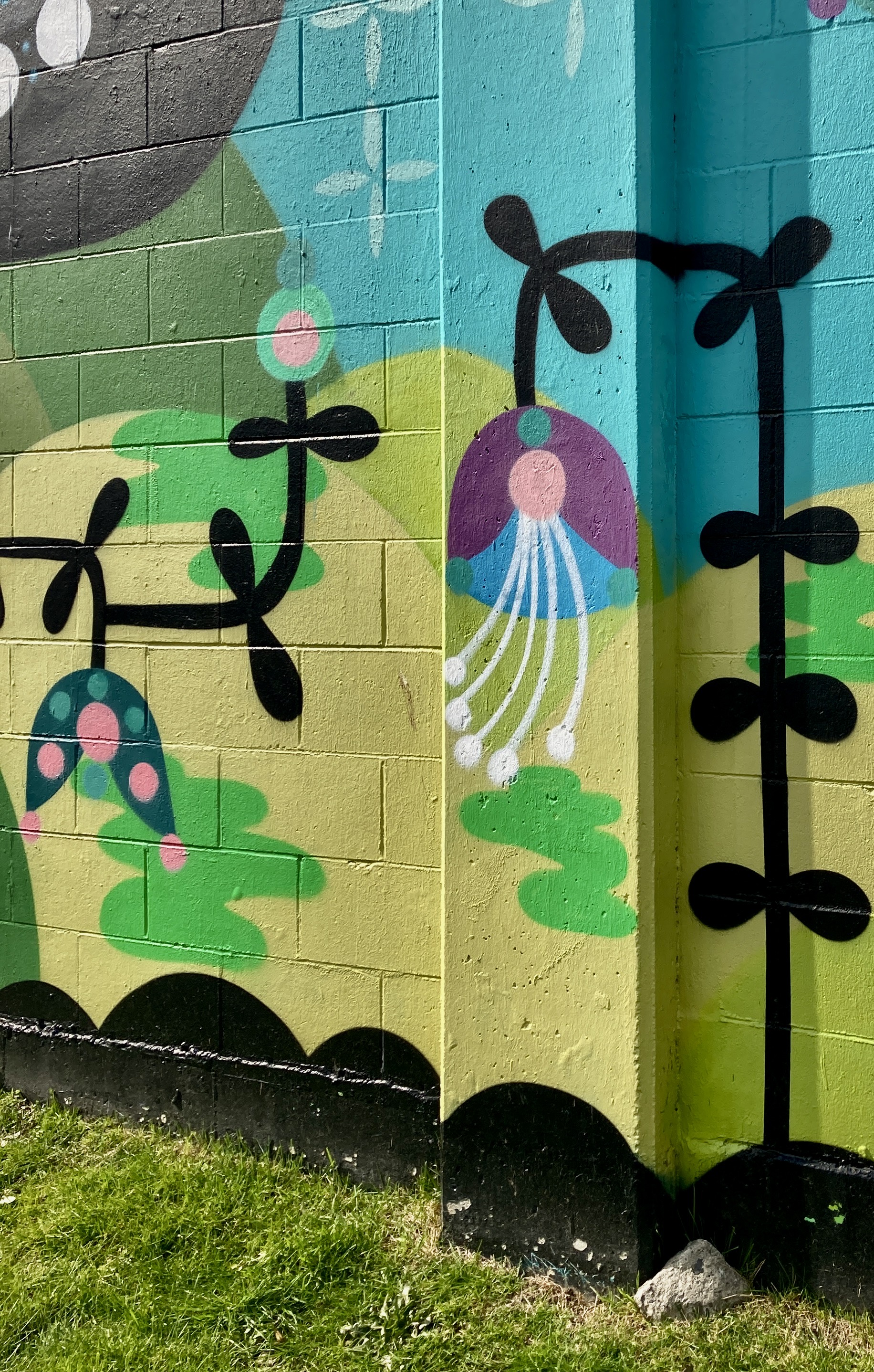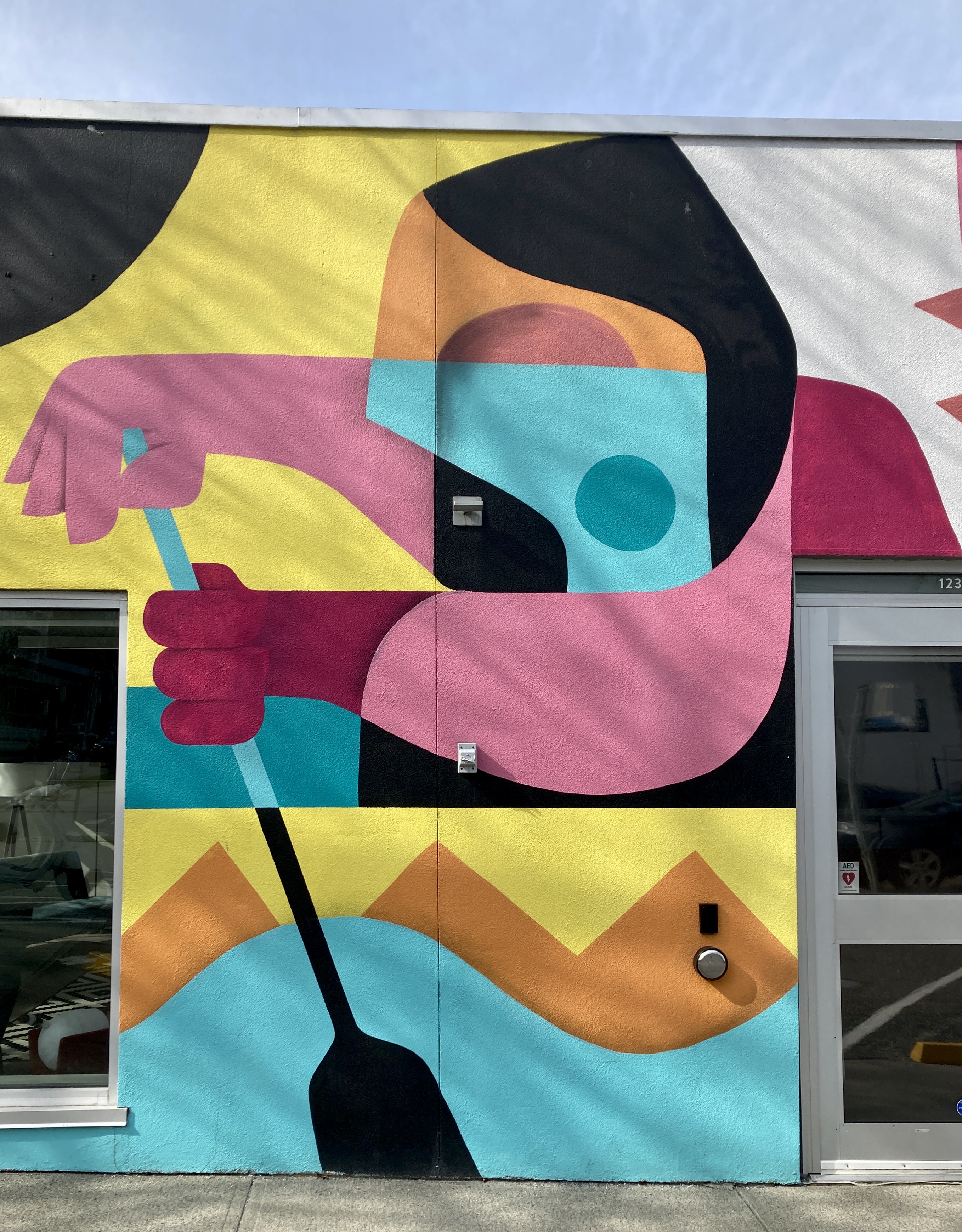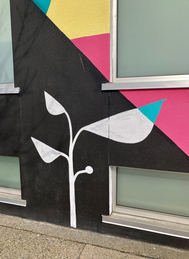 Ghosts of Eras Past to the north of me as well — torn fencing frames the Cosmic Breeze mural on 3rd Avenue, painted by Olivia di Liberto for the 2019 Vancouver Mural Festival. RIP, VMF.