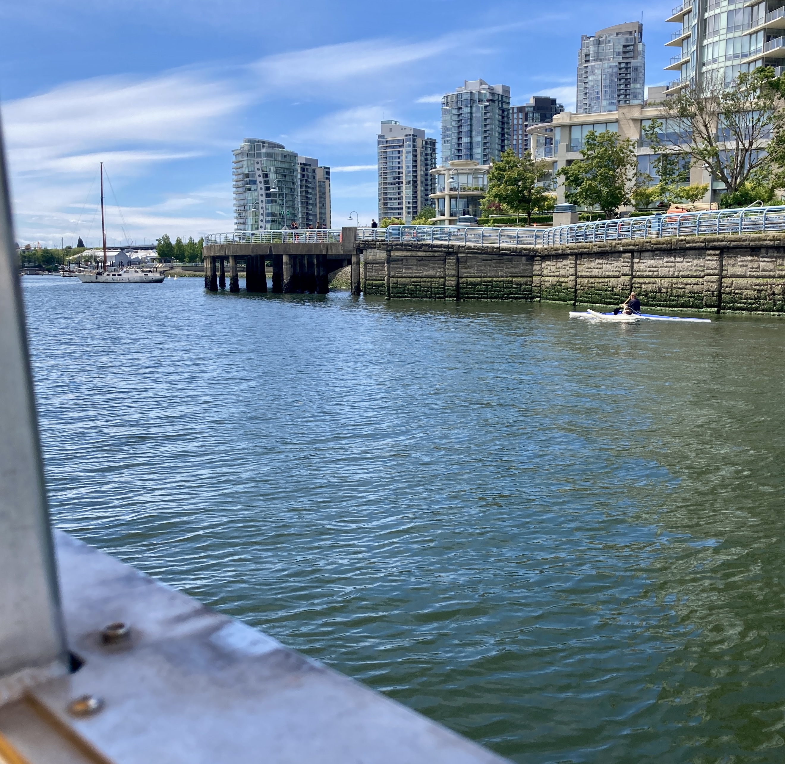 Eastward along the False Creek Seawall, past a swimming dog (and ball-tossing owner)…