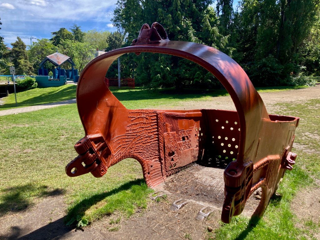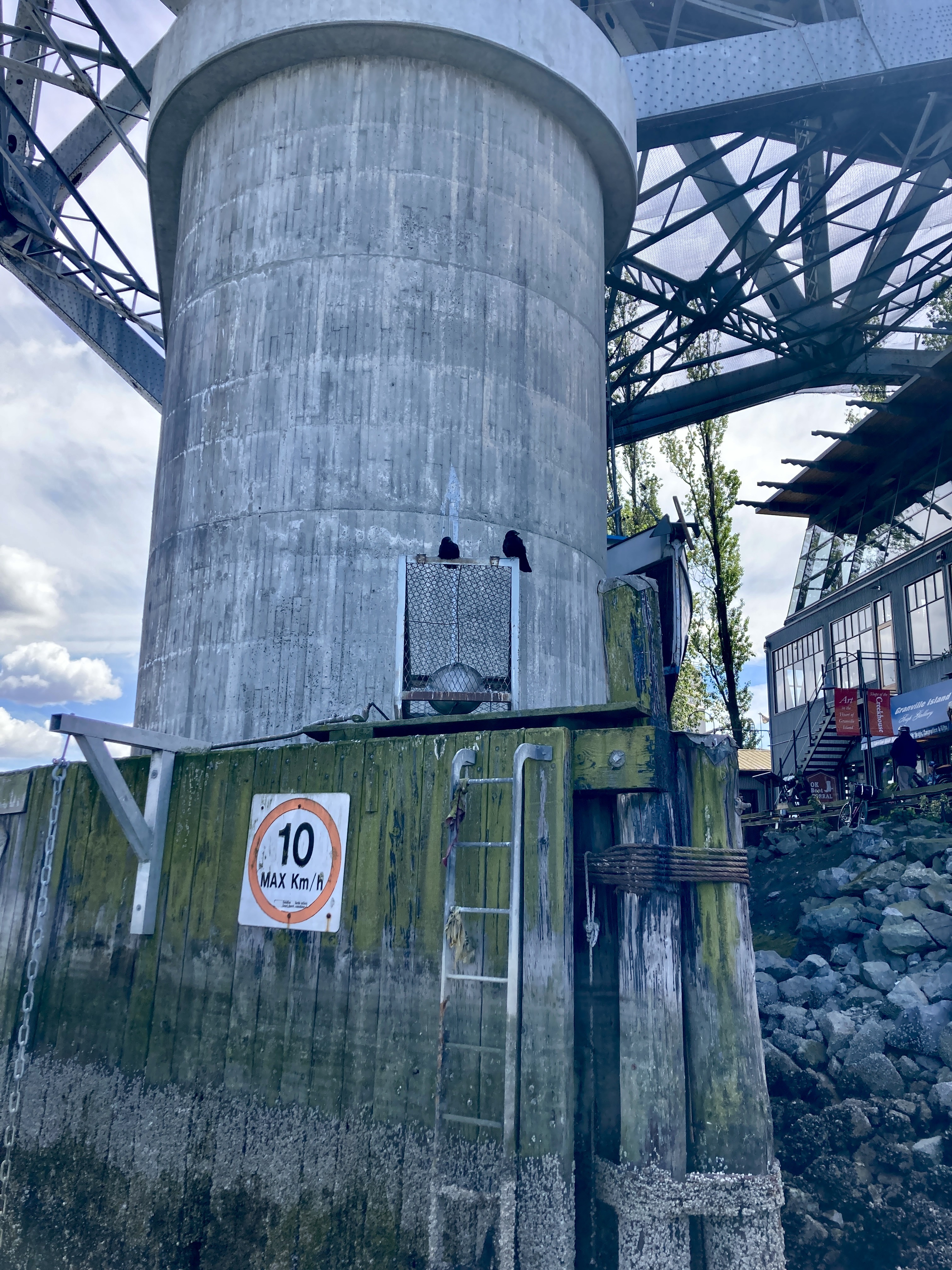 and then I’m beneath the towering girders at the David Lam ferry dock. Each girder base is incised with a different story of time & place.