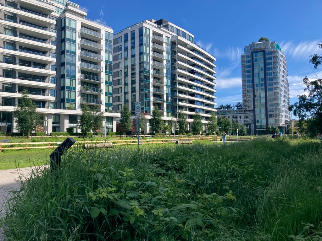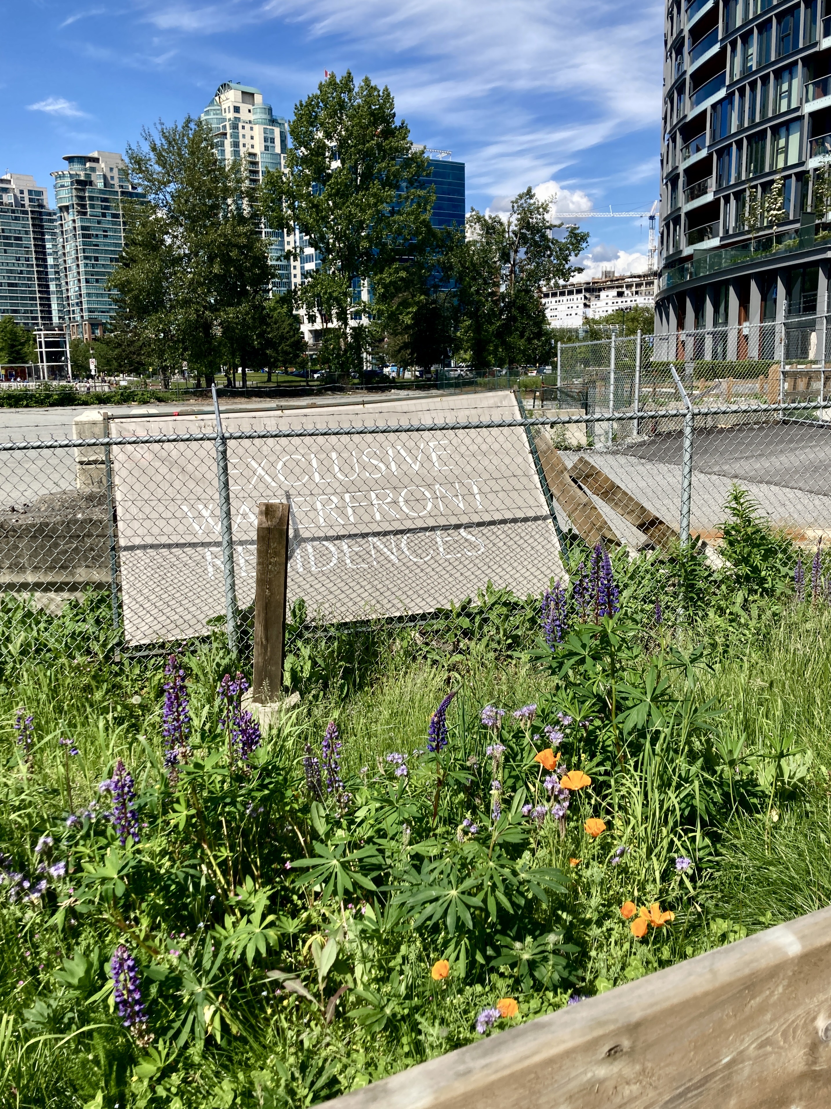 On past Emery Barnes Park at Davie, and then across Pacific Blvd., right to the tumbling fountains of George Wainborn Park, which slopes down to the Creek.
