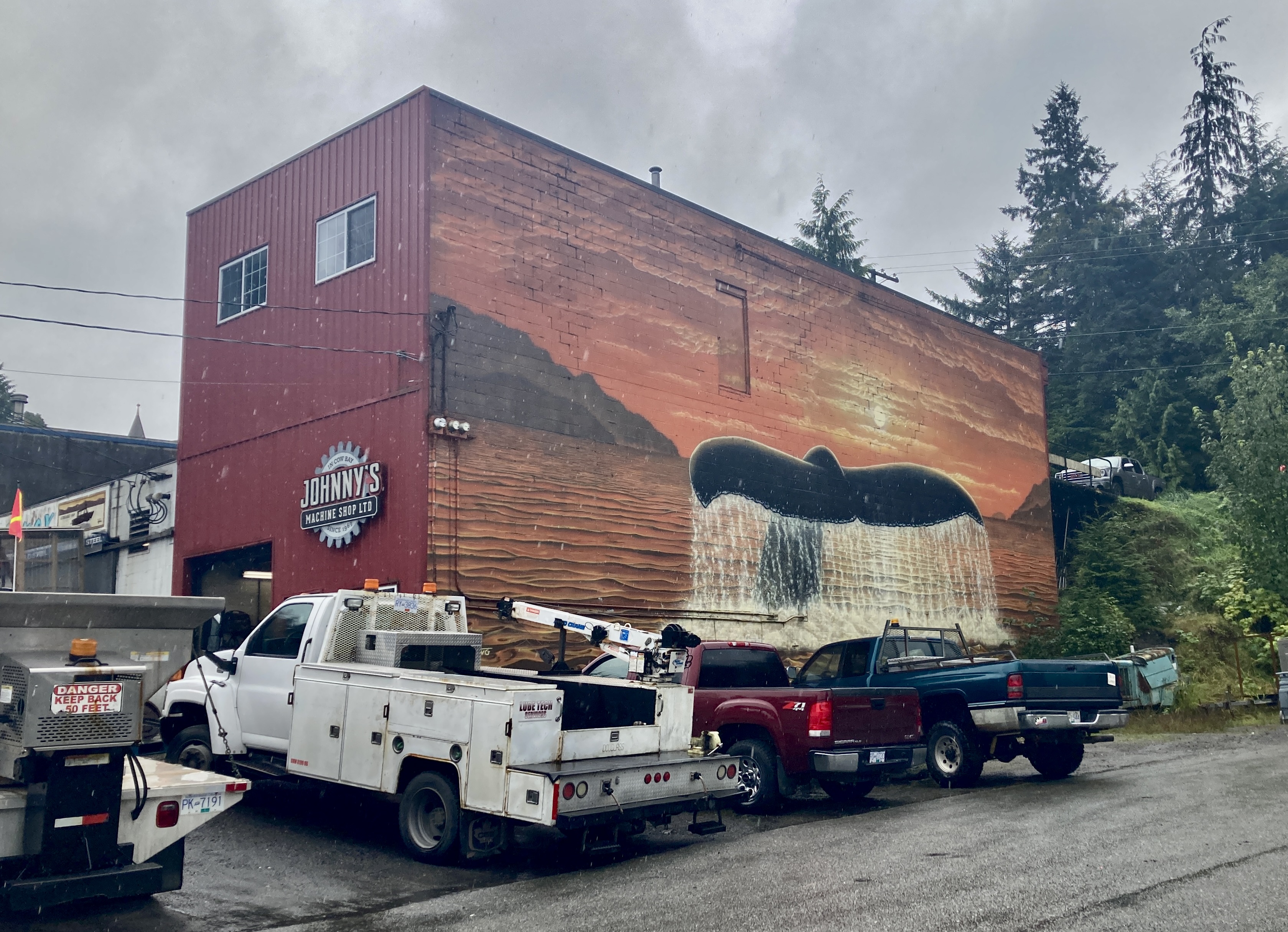 and later a reminder, down at Harwood, of developer/cultural handshakes, here in the form of this Beyond the Mountains mural commissioned by the builder from Heiltsuk artist KC Hall.
