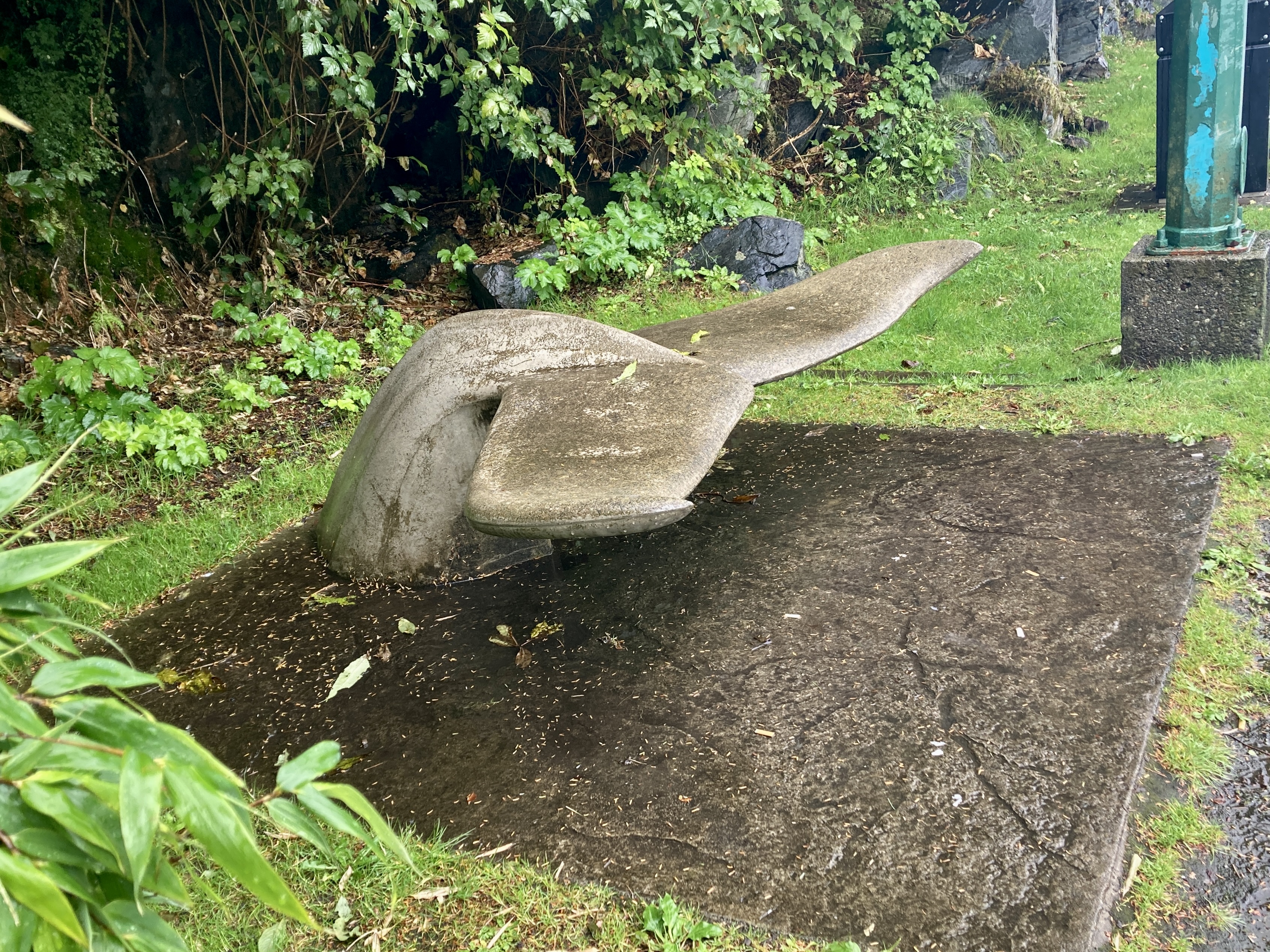 Enough blazing sunshine. I forsake the Seawall to climb uphill to Beach Ave. and the shade offered by its trees. It gives me a distant view of Squamish artist Chrystal Sparrow’s mural on the Sunset Beach sport court, currently being repainted…